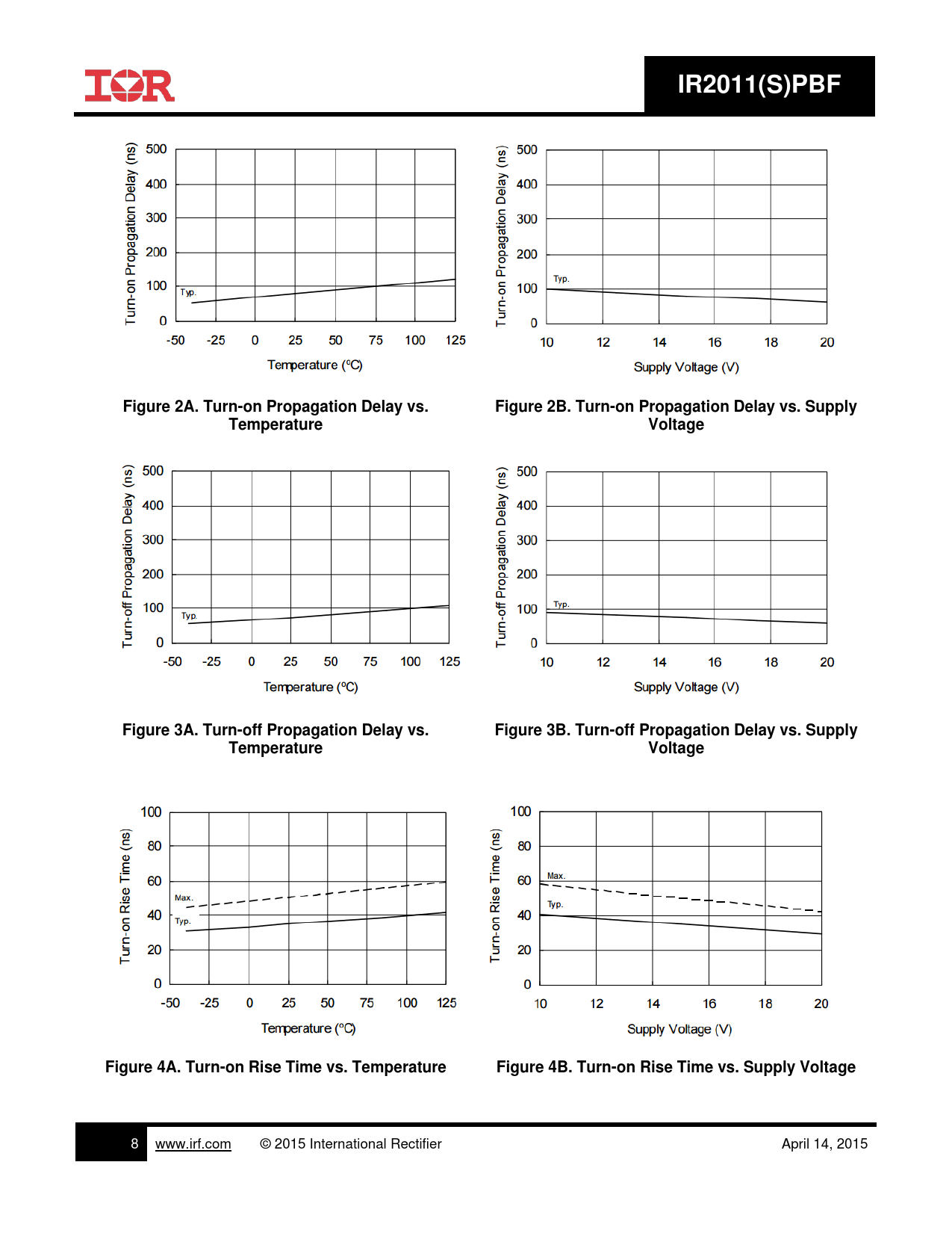 IR2011(S)PBF Figure 2A. Turn-on Propagation Delay vs. Figure 2B. Turn-on Propagation Delay vs. Supply Temperature Voltage Figure 3A. Turn-off Propagation Delay vs. Figure 3B. Turn-off Propagation Delay vs. Supply Temperature Voltage Figure 4A. Turn-on Rise Time vs. Temperature Figure 4B. Turn-on Rise Time vs. Supply Voltage