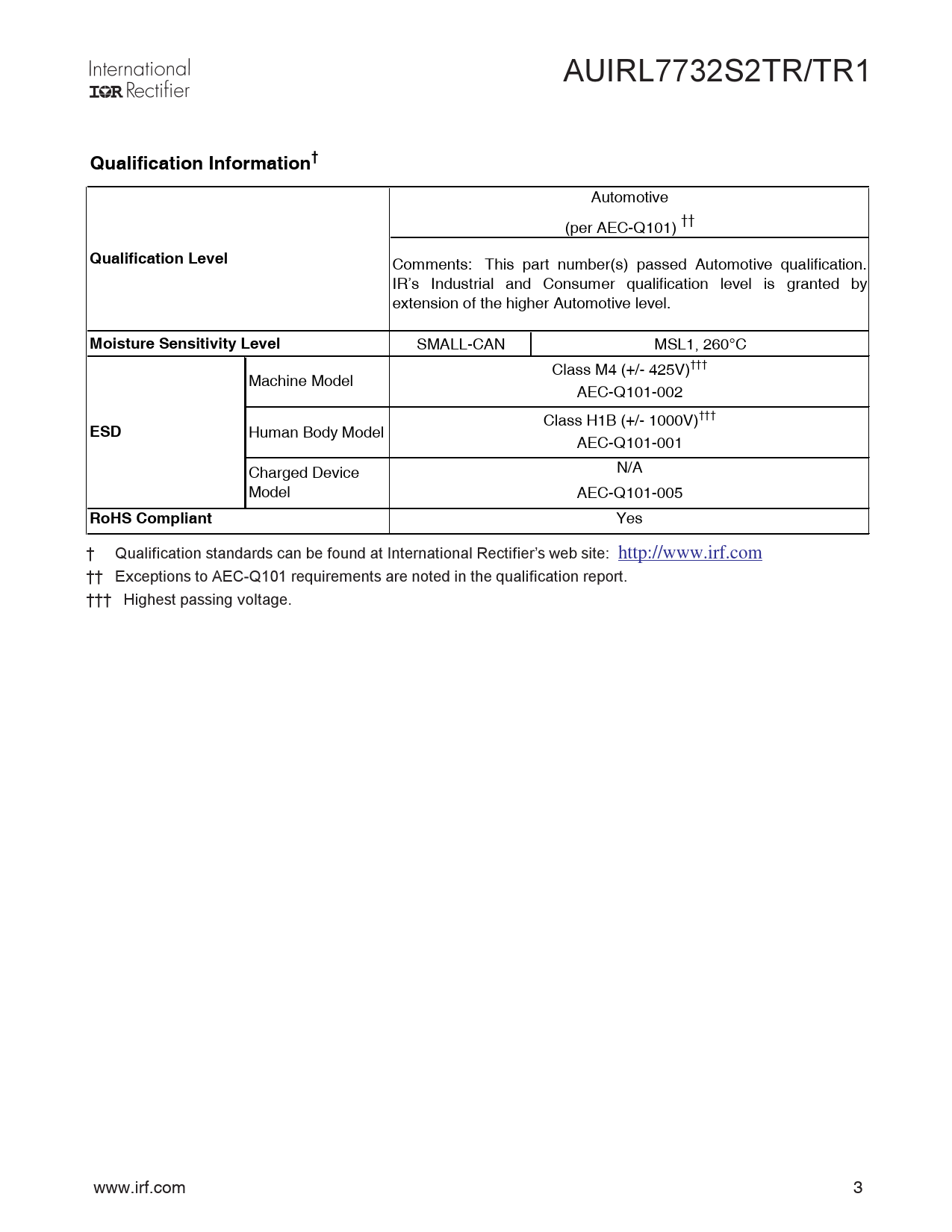Yes † Qualification standards can be found at International Rectifier’s web site: http://www.irf.com †† Exceptions to AEC-Q101 requirements are noted in the qualification report. ††† Highest passing voltage. www.irf.com 3