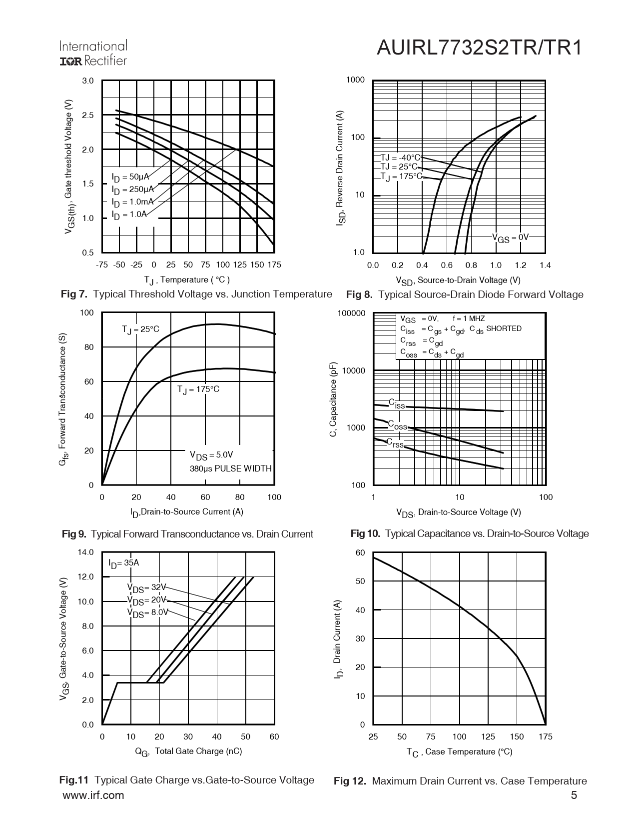 AUIRL7732S2TR/TR1 3.0 1000 ) V( e 2.5 ) g A( a t t l n o e V r r 100 dl u 2.0 o C h n s i TJ = -40°C e a r r TJ = 25°C ht D I T e e J = 175°C t 1.5 D = 50μA s a I re G D = 250μA v 10 , e ) I h D = 1.0mA R t ( , S 1.0 ID = 1.0A D G I S V VGS = 0V 0.5 1.0 -75 -50 -25 0 25 50 75 100 125 150 175 0.0 0.2 0.4 0.6 0.8 1.0 1.2 1.4 TJ , Temperature ( °C ) VSD, Source-to-Drain Voltage (V)