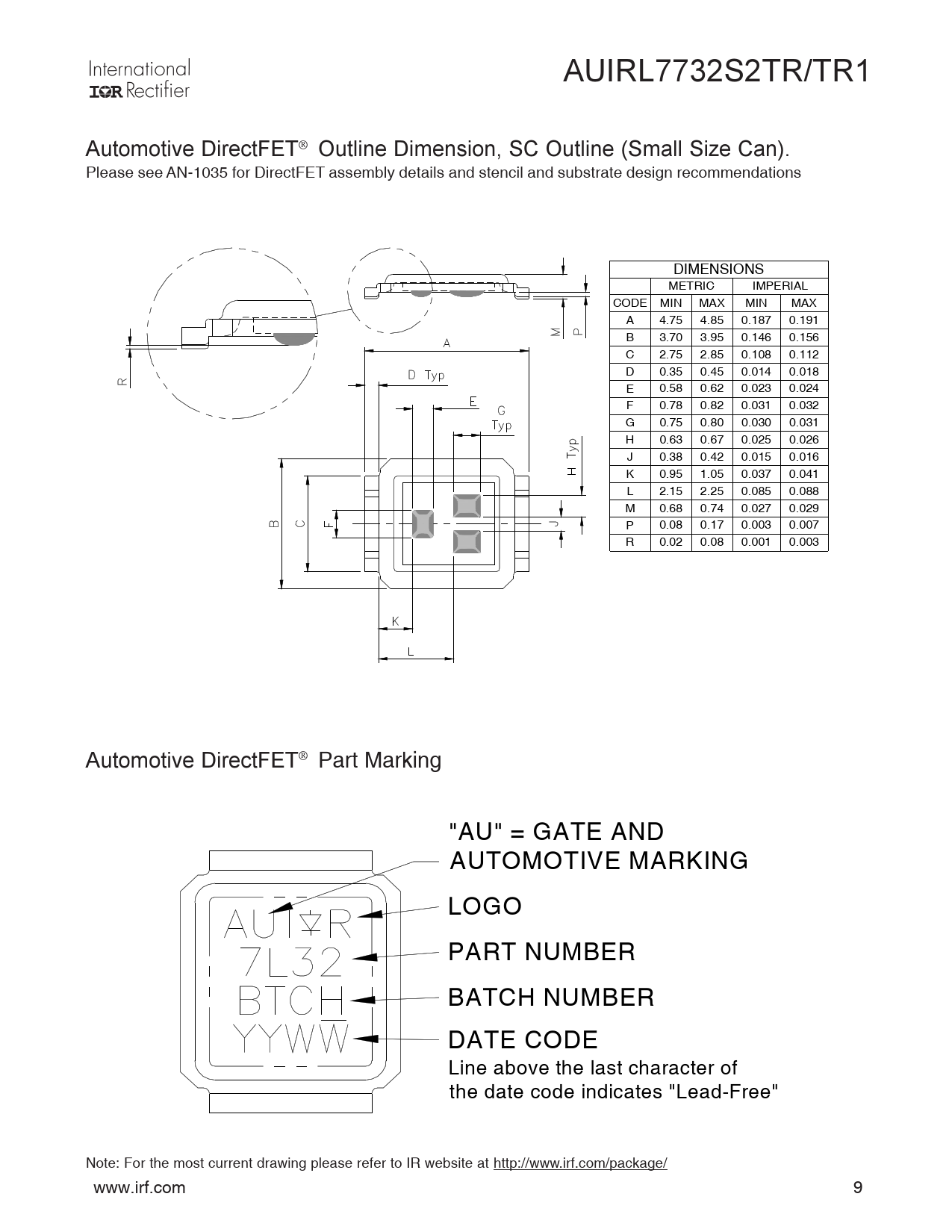 AUIRL7732S2TR/TR1 Automotive DirectFET® Outline Dimension, SC Outline (Small Size Can). Please see AN-1035 for DirectFET assembly details and stencil and substrate design recommendations DIMENSIONS METRIC IMPERIAL CODE MIN MAX MIN MAX A 4.75 4.85 0.187 0.191 B 3.70 3.95 0.146 0.156 C 2.75 2.85 0.108 0.112 D 0.35 0.45 0.014 0.018 E 0.58 0.62 0.023 0.024 F 0.78 0.82 0.031 0.032 G 0.75 0.80 0.030 0.031 H 0.63 0.67 0.025 0.026 J 0.38 0.42 0.015 0.016 K 0.95 1.05 0.037 0.041 L 2.15 2.25 0.085 0.088 M 0.68 0.74 0.027 0.029 P 0.08 0.17 0.003 0.007 R 0.02 0.08 0.001 0.003 Automotive DirectFET® Part Marking "AU" = GATE AND AUTOMOTIVE MARKING LOGO PART NUMBER BATCH NUMBER DATE CODE Line above the last character of the date code indicates "Lead-Free" Note: For the most current drawing please refer to IR website at http://www.irf.com/package/ www.irf.com 9