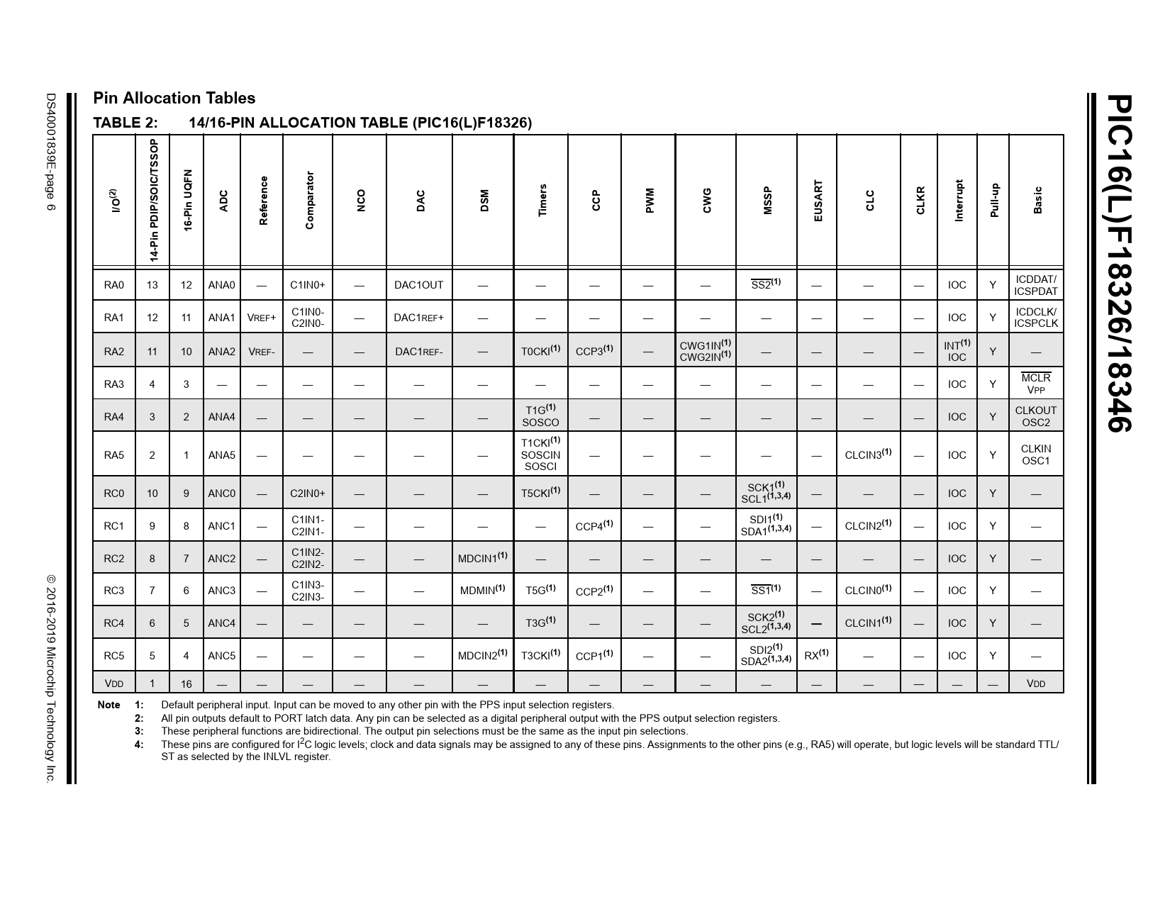 | Pages / Page | 500 / 6 — PIC16(L)F18326/18346. Pin Allocation Tables TABLE 2:. 14/16-PIN … |