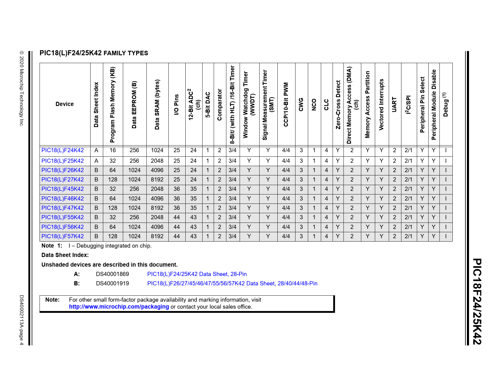 PIC18(L)F24/25K42 FAMILY TYPES. r e. ime. y (K. ) s. im T. isab. (B). rtition. -Bit T. mor. og T. ent. Selec. ndex. rrup. le D. t I. ator. cce. s De. Device. ) /16