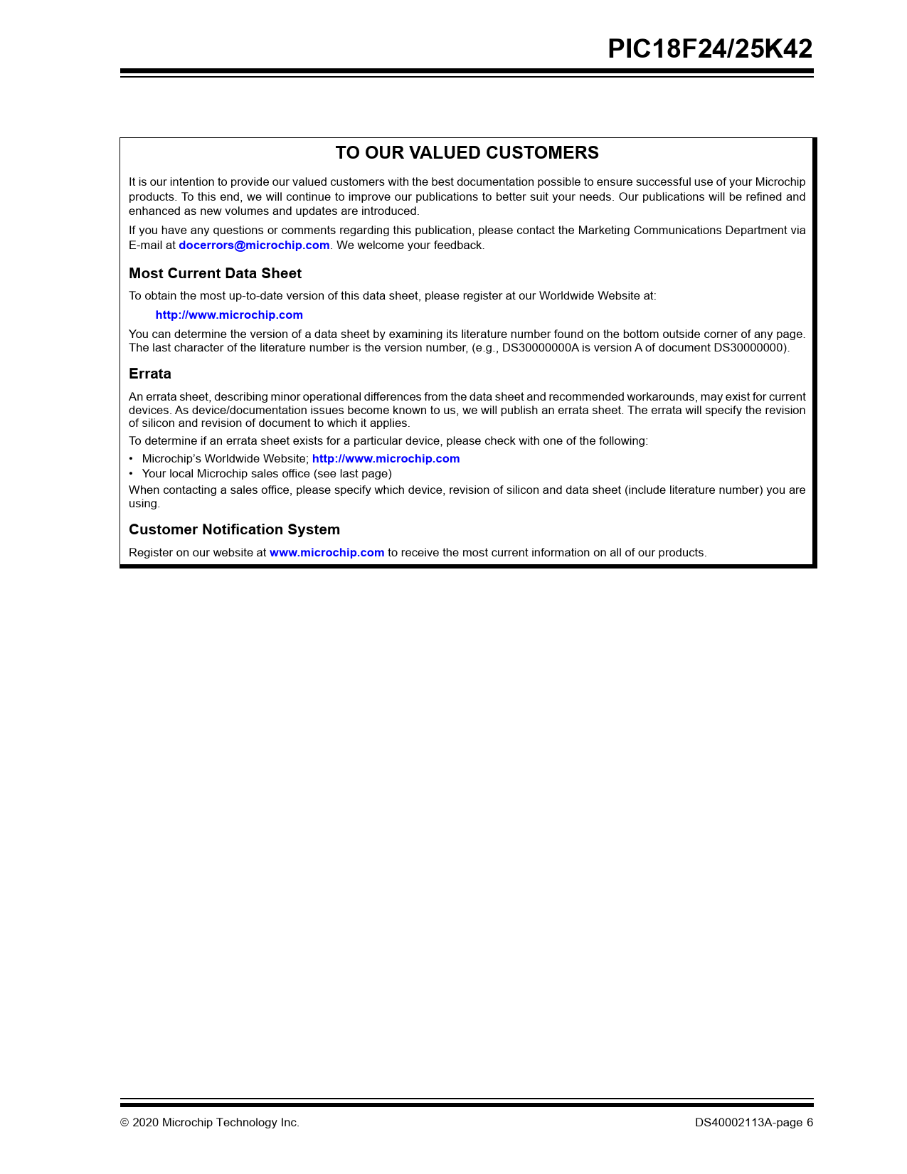 PIC18F24/25K42TO OUR VALUED CUSTOMERS It is our intention to provide our valued customers with the best documentation possible to ensure successful use of your Microchip products. To this end, we will continue to improve our publications to better suit your needs. Our publications will be refined and enhanced as new volumes and updates are introduced. If you have any questions or comments regarding this publication, please contact the Marketing Communications Department via E-mail at docerrors@microchip.com . We welcome your feedback. Most Current Data Sheet To obtain the most up-to-date version of this data sheet, please register at our Worldwide Website at: http://www.microchip.com You can determine the version of a data sheet by examining its literature number found on the bottom outside corner of any page. The last character of the literature number is the version number, (e.g., DS30000000A is version A of document DS30000000). Errata An errata sheet, describing minor operational differences from the data sheet and recommended workarounds, may exist for current devices. As device/documentation issues become known to us, we will publish an errata sheet. The errata will specify the revision of silicon and revision of document to which it applies. To determine if an errata sheet exists for a particular device, please check with one of the fol owing: • Microchip’s Worldwide Website; http://www.microchip.com • Your local Microchip sales office (see last page) When contacting a sales office, please specify which device, revision of silicon and data sheet (include literature number) you are using. Customer Notification System Register on our website at www.microchip.com to receive the most current information on all of our products. 2020 Microchip Technology Inc. DS40002113A-page 6 Document Outline Description Family Types Table of Contents 1.0 Device Overview 2.0 Electrical Characteristics TABLE 2-1: Supply Voltage (High Temperature) FIGURE 2-1: Voltage-Frequency Graph, -40°C £ Ta £ +150°C TABLE 2-2: DC Characteristics: Supply Current (Idd)(1,2) TABLE 2-3: DC Characteristics: Power-Down Currents (Ipd)(1,2,3) TABLE 2-4: Memory Specifications (150°C) TABLE 2-5: Internal Oscillator Parameters(1) FIGURE 3-2: Precision-Calibrated HFINTOSC Frequency Accuracy Over Device Vdd and Temperature TABLE 2-6: Reset, Watchdog Timer, Oscillator Start-up Timer, Power-up Timer, Brown-out Timer and Low-Power Brown-out Reset Specifications TABLE 2-7: High/Low-Voltage Detect Characteristics TABLE 2-8: Fixed Voltage Reference (FVR) Specifications Appendix A: Revision History Product ID System Trademarks Worldwide Sales