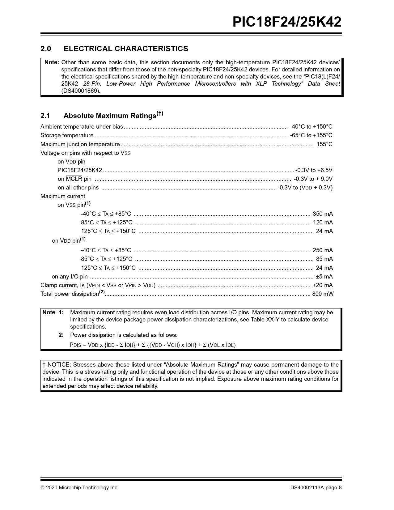 PIC18F24/25K422.0ELECTRICAL CHARACTERISTICSNote: Other than some basic data, this section documents only the high-temperature PIC18F24/25K42 devices’ specifications that differ from those of the non-specialty PIC18F24/25K42 devices. For detailed information on the electrical specifications shared by the high-temperature and non-specialty devices, see the “PIC18(L)F24/ 25K42 28-Pin, Low-Power High Performance Microcontrollers with XLP Technology” Data Sheet (DS40001869). 2.1Absolute Maximum Ratings(†) Ambient temperature under bias .. -40°C to +150°C Storage temperature .. -65°C to +155°C Maximum junction temperature .. 155°C Voltage on pins with respect to VSS on VDD pin PIC18F24/25K42 ... -0.3V to +6.5V on MCLR pin .. -0.3V to + 9.0V on all other pins .. -0.3V to (VDD + 0.3V) Maximum current on VSS pin (1) -40°C TA +85°C .. 350 mA 85°C TA +125°C ... 120 mA 125°C TA +150°C ... 24 mA on VDD pin (1) -40°C TA +85°C .. 250 mA 85°C TA +125°C ... 85 mA 125°C TA +150°C ... 24 mA on any I/O pin ... 5 mA Clamp current, IK (VPIN < VSS or VPIN > VDD) ... 20 mA Total power dissipation (2) .. 800 mW Note 1: Maximum current rating requires even load distribution across I/O pins. Maximum current rating may be limited by the device package power dissipation characterizations, see Table XX-Y to calculate device specifications. 2: Power dissipation is calculated as follows: PDIS = VDD x {IDD - IOH} + VDD - VOH) x IOH} + VOL x IOL † NOTICE: Stresses above those listed under “Absolute Maximum Ratings” may cause permanent damage to the device. This is a stress rating only and functional operation of the device at those or any other conditions above those indicated in the operation listings of this specification is not implied. Exposure above maximum rating conditions for extended periods may affect device reliability. 2020 Microchip Technology Inc. DS40002113A-page 8 Document Outline Description Family Types Table of Contents 1.0 Device Overview 2.0 Electrical Characteristics TABLE 2-1: Supply Voltage (High Temperature) FIGURE 2-1: Voltage-Frequency Graph, -40°C £ Ta £ +150°C TABLE 2-2: DC Characteristics: Supply Current (Idd)(1,2) TABLE 2-3: DC Characteristics: Power-Down Currents (Ipd)(1,2,3) TABLE 2-4: Memory Specifications (150°C) TABLE 2-5: Internal Oscillator Parameters(1) FIGURE 3-2: Precision-Calibrated HFINTOSC Frequency Accuracy Over Device Vdd and Temperature TABLE 2-6: Reset, Watchdog Timer, Oscillator Start-up Timer, Power-up Timer, Brown-out Timer and Low-Power Brown-out Reset Specifications TABLE 2-7: High/Low-Voltage Detect Characteristics TABLE 2-8: Fixed Voltage Reference (FVR) Specifications Appendix A: Revision History Product ID System Trademarks Worldwide Sales