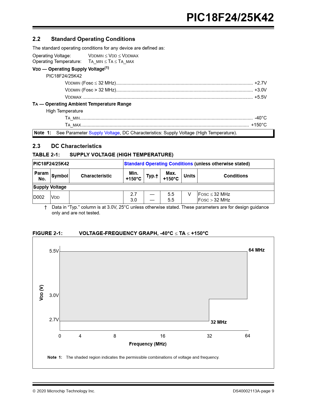 link to page 9 link to page 9 PIC18F24/25K422.2Standard Operating Conditions The standard operating conditions for any device are defined as: Operating Voltage: VDDMIN VDD VDDMAX Operating Temperature: TA_MIN TA TA_MAX VDD — Operating Supply Voltage(1) PIC18F24/25K42 VDDMIN (Fosc 32 MHz).. +2.7V VDDMIN (Fosc > 32 MHz).. +3.0V VDDMAX .. +5.5V TA — Operating Ambient Temperature Range High Temperature TA_MIN.. -40°C TA_MAX.. +150°C Note 1: See Parameter Supply Voltage, DC Characteristics: Supply Voltage (High Temperature). 2.3DC CharacteristicsTABLE 2-1:SUPPLY VOLTAGE (HIGH TEMPERATURE)PIC18F24/25K42Standard Operating Conditions (unless otherwise stated)ParamMin.Max.SymbolCharacteristicTyp.†UnitsConditionsNo.+150°C+150°CSupply Voltage 2.7 — 5.5 V F D002 V OSC 32 MHz DD 3.0 — 5.5 FOSC 32 MHz † Data in “Typ.” column is at 3.0V, 25°C unless otherwise stated. These parameters are for design guidance only and are not tested. FIGURE 2-1:VOLTAGE-FREQUENCY GRAPH, -40°C TA +150°C 5.5V 64 MHz(V) DD 3.0V V 2.7V 32 MHz 0 4 8 16 32 64 Frequency (MHz)Note 1: The shaded region indicates the permissible combinations of voltage and frequency. 2020 Microchip Technology Inc. DS40002113A-page 9 Document Outline Description Family Types Table of Contents 1.0 Device Overview 2.0 Electrical Characteristics TABLE 2-1: Supply Voltage (High Temperature) FIGURE 2-1: Voltage-Frequency Graph, -40°C £ Ta £ +150°C TABLE 2-2: DC Characteristics: Supply Current (Idd)(1,2) TABLE 2-3: DC Characteristics: Power-Down Currents (Ipd)(1,2,3) TABLE 2-4: Memory Specifications (150°C) TABLE 2-5: Internal Oscillator Parameters(1) FIGURE 3-2: Precision-Calibrated HFINTOSC Frequency Accuracy Over Device Vdd and Temperature TABLE 2-6: Reset, Watchdog Timer, Oscillator Start-up Timer, Power-up Timer, Brown-out Timer and Low-Power Brown-out Reset Specifications TABLE 2-7: High/Low-Voltage Detect Characteristics TABLE 2-8: Fixed Voltage Reference (FVR) Specifications Appendix A: Revision History Product ID System Trademarks Worldwide Sales