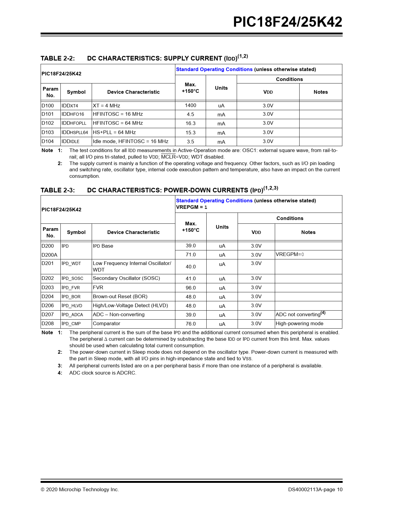 TABLE 2-3: DC CHARACTERISTICS: POWER-DOWN CURRENTS (IPD)(1,2,3) Standard Operating Conditions (unless otherwise stated) PIC18F24/25K42 VREPGM = 1 Conditions Max. Units Param +150°C Symbol Device Characteristic VDD Notes No.