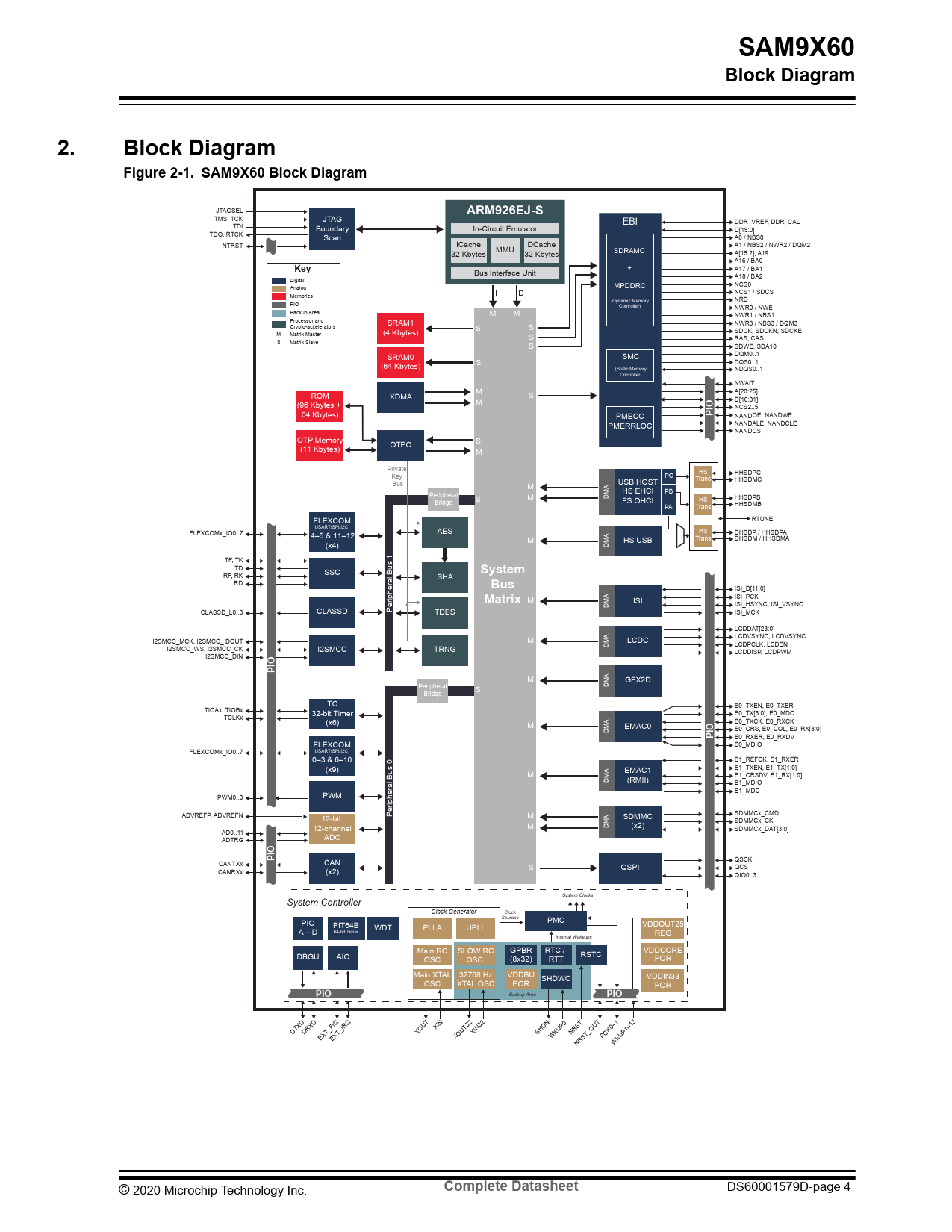 SAM9X60. Block Diagram. Block Diagram Figure 2-1. SAM9X60 Block Diagram. ARM926EJ-S. Key. PIO. System. Bus. Matrix. Complete Datasheet