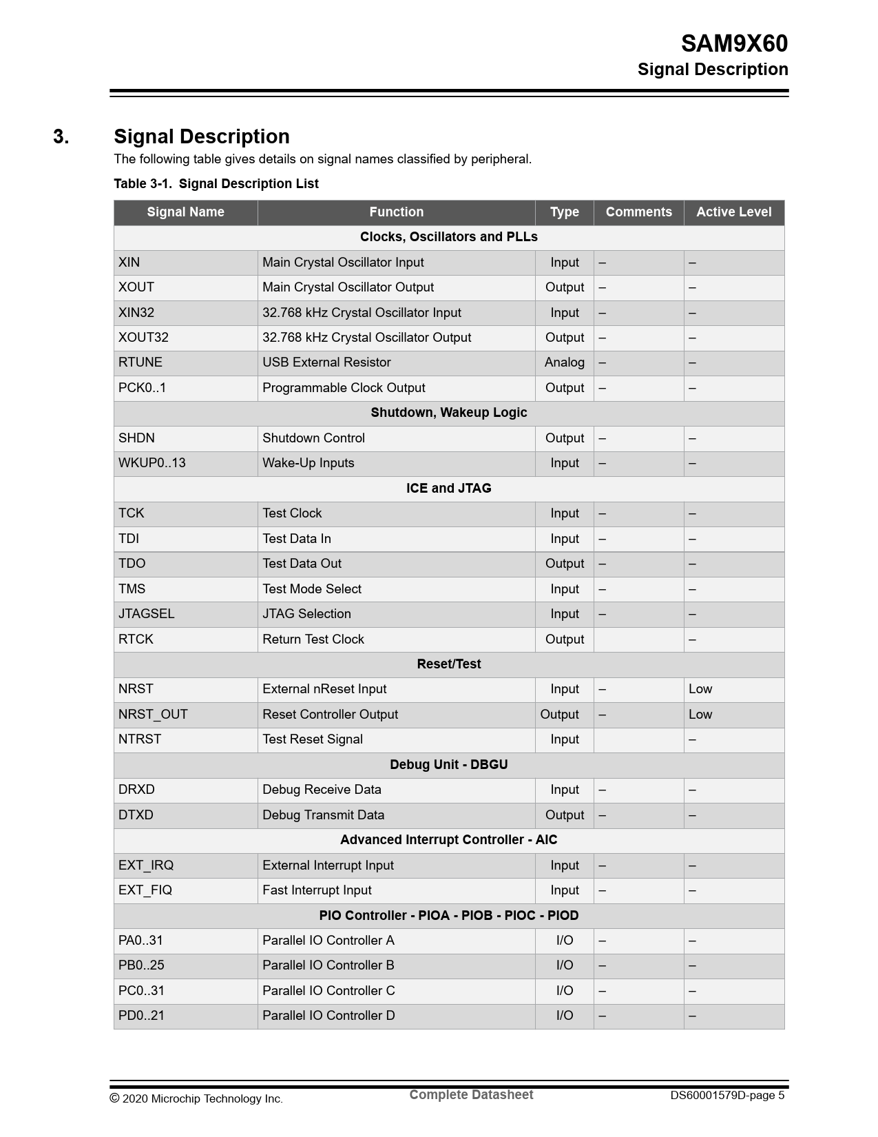 | Pages / Page | 2159 / 5 — SAM9X60. Signal Description. Table 3-1. Signal Description List. Signal … |