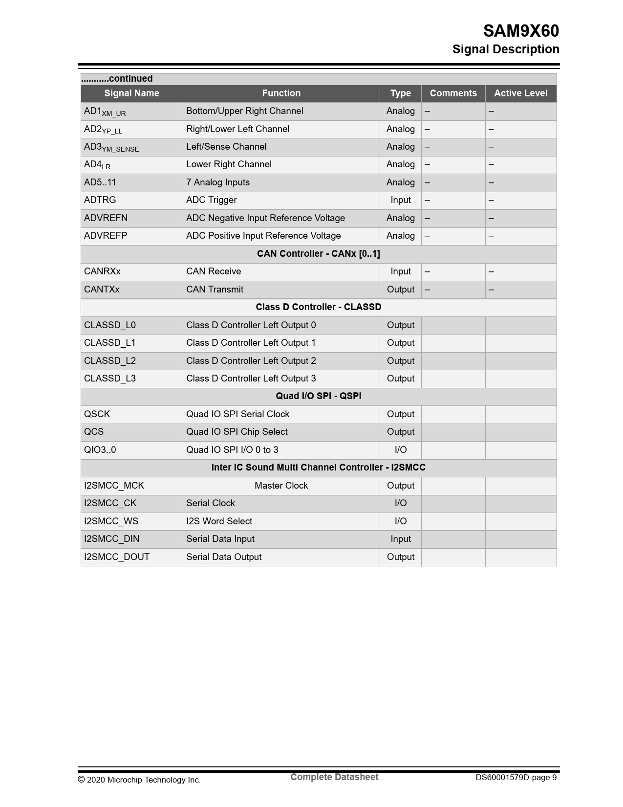 SAM9X60. Signal Description. ...continued. Signal Name. Function. Type. Comments. Active Level. CAN Controller - CANx [0..1]