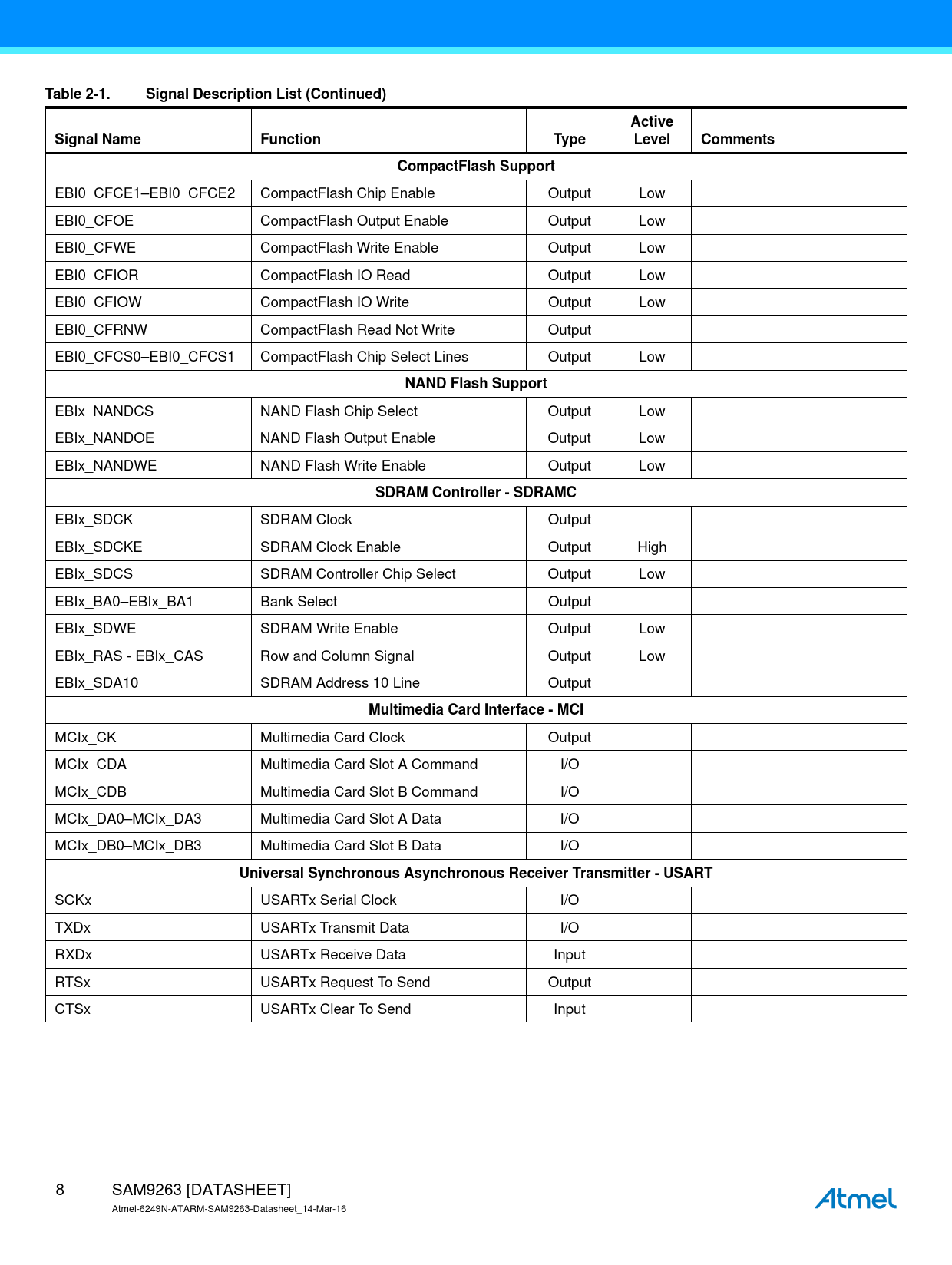 Table 2-1. Signal Description List (Continued). Active. Signal Name. Function. Type. Level. Comments. CompactFlash Support