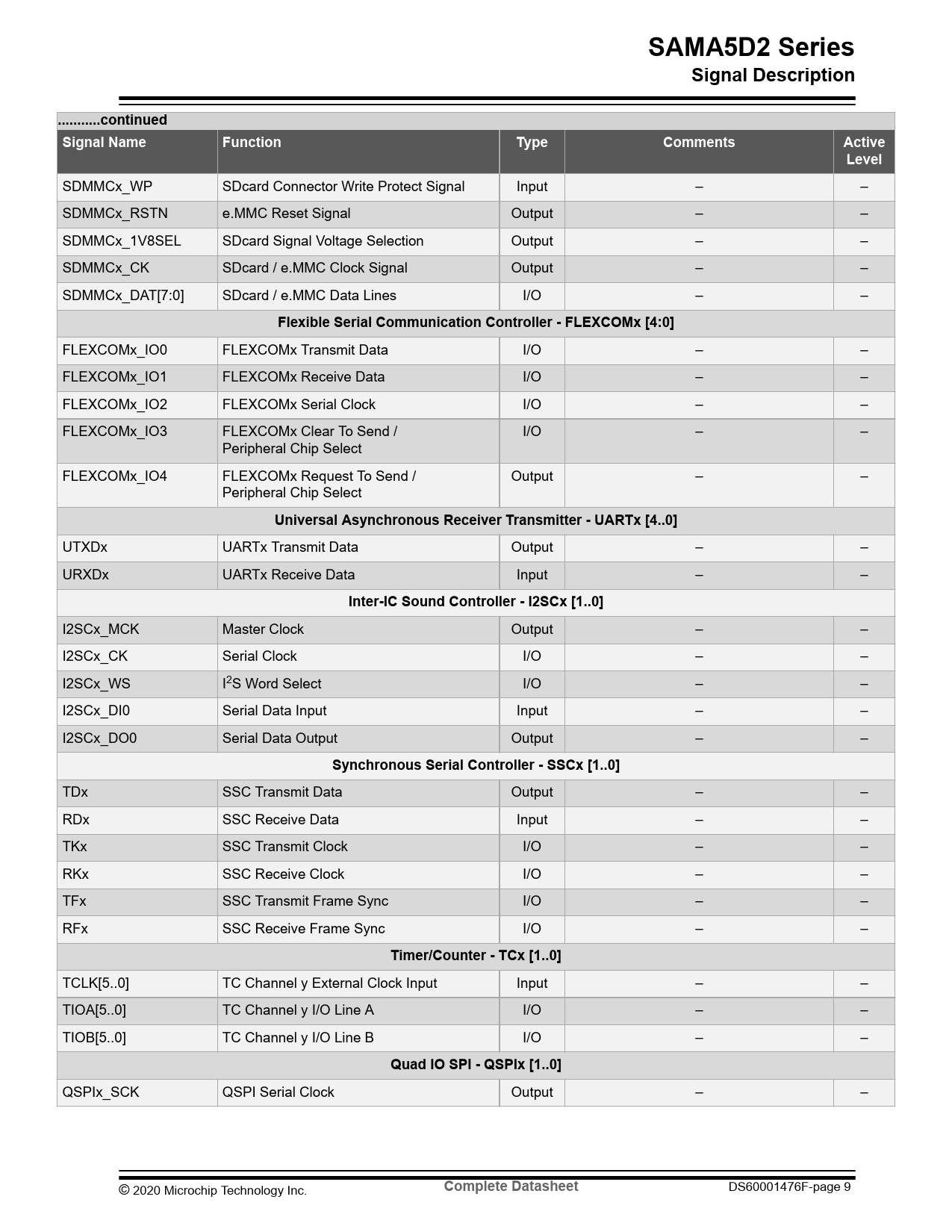 | Pages / Page | 2727 / 9 — SAMA5D2 Series. Signal Description. ...continued. Signal Name. Function. … |