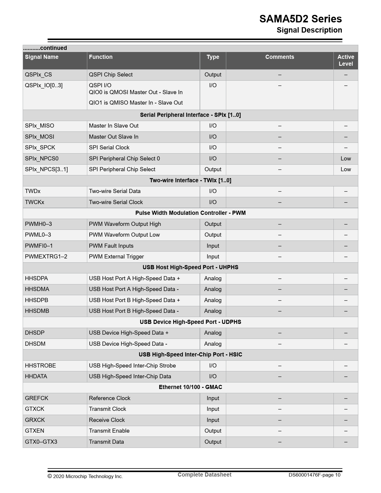 SAMA5D2 Series. Signal Description. ...continued. Signal Name. Function. Type. Comments. Active. Level
