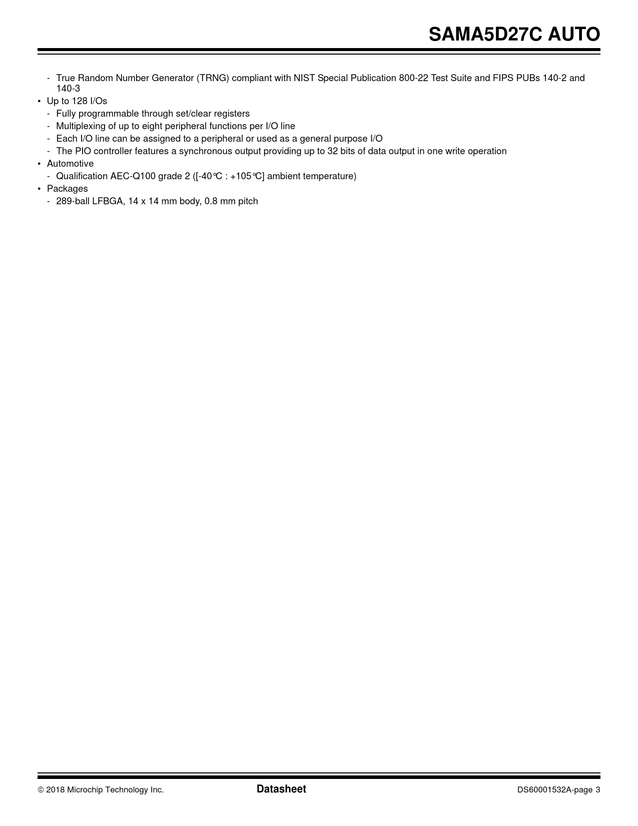 - True Random Number Generator (TRNG) compliant with NIST Special Publication 800-22 Test Suite and FIPS PUBs 140-2 and 140-3 • Up to 128 I/Os - Fully programmable through set/clear registers - Multiplexing of up to eight peripheral functions per I/O line - Each I/O line can be assigned to a peripheral or used as a general purpose I/O - The PIO controller features a synchronous output providing up to 32 bits of data output in one write operation • Automotive - Qualification AEC-Q100 grade 2 ([-40°C : +105°C] ambient temperature) • Packages - 289-ball LFBGA, 14 x 14 mm body, 0.8 mm pitch 2018 Microchip Technology Inc.