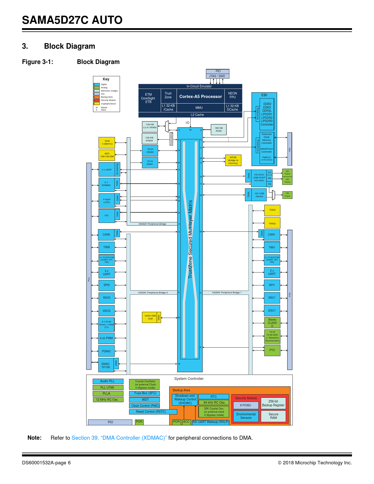 | Pages / Page | 2554 / 6 — SAMA5D27C AUTO. Block Diagram. Figure 3-1:. Key. Cortex-A5 Processor. … |