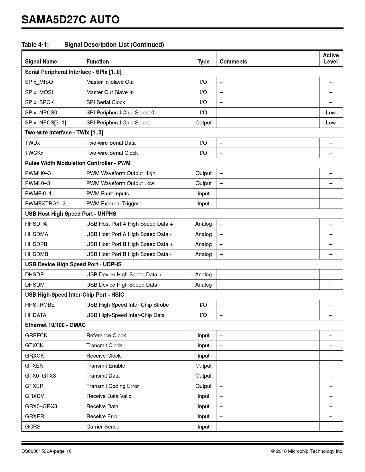 | Pages / Page | 2554 / 10 — SAMA5D27C AUTO. Table 4-1:. Signal Description List (Continued). Active. … |