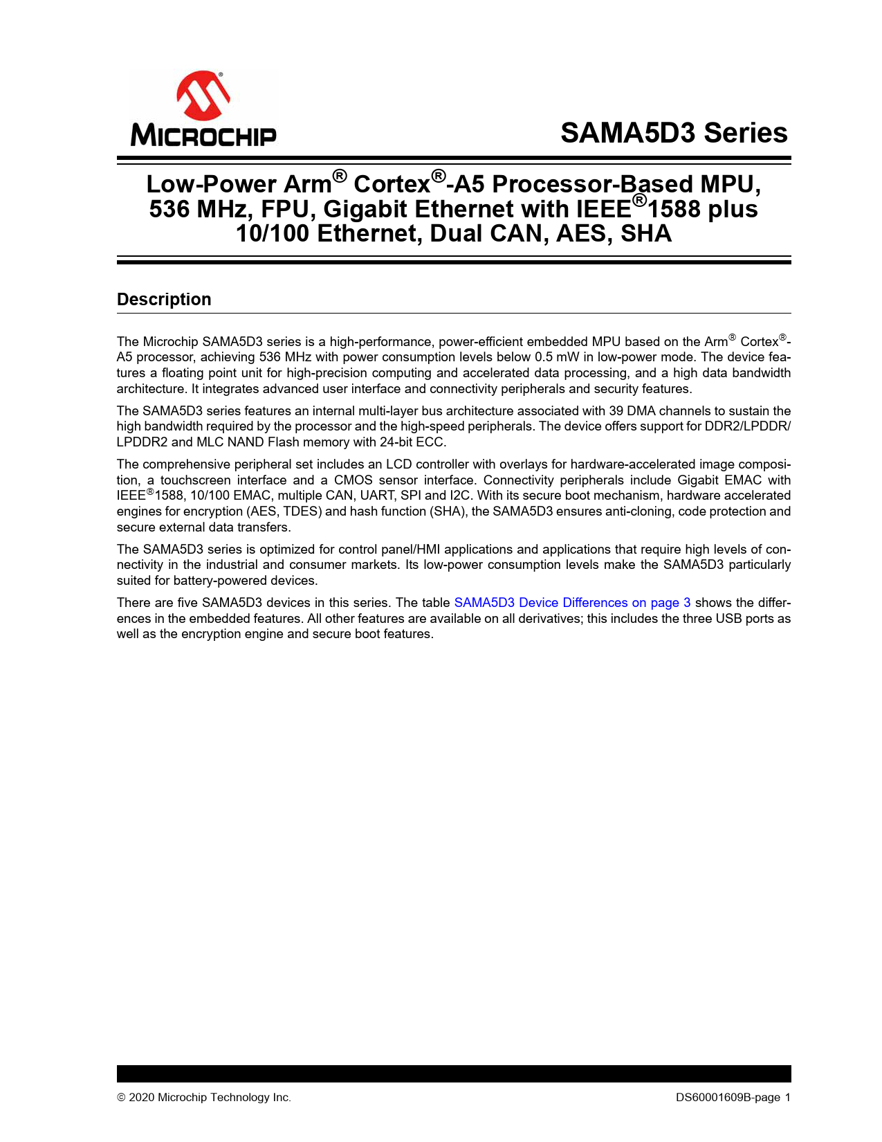 SAMA5D3 Series. Low-Power Arm® Cortex®-A5 Processor-Based MPU,. 536 MHz, FPU, Gigabit Ethernet with IEEE®1588 plus