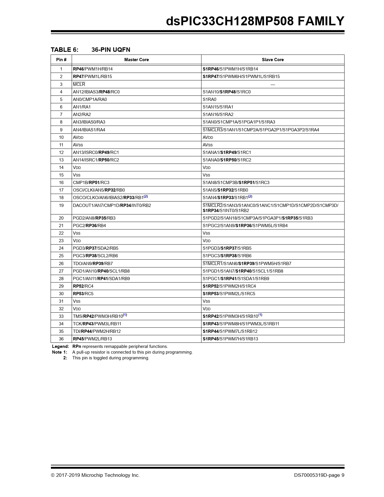 | Pages / Page | 822 / 9 — dsPIC33CH128MP508 FAMILY. TABLE 6:. 36-PIN UQFN. Pin #. Master Core. … |
