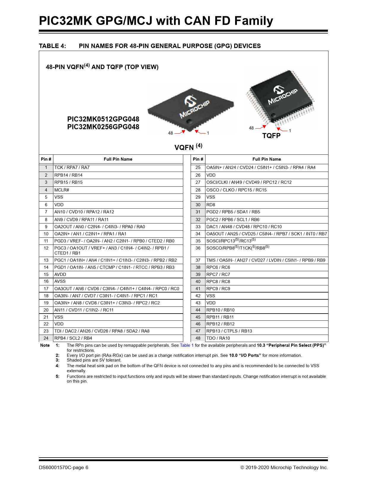 | Pages / Page | 684 / 6 — PIC32MK GPG/MCJ with CAN FD Family. TABLE 4:. PIN NAMES FOR 48-PIN … |