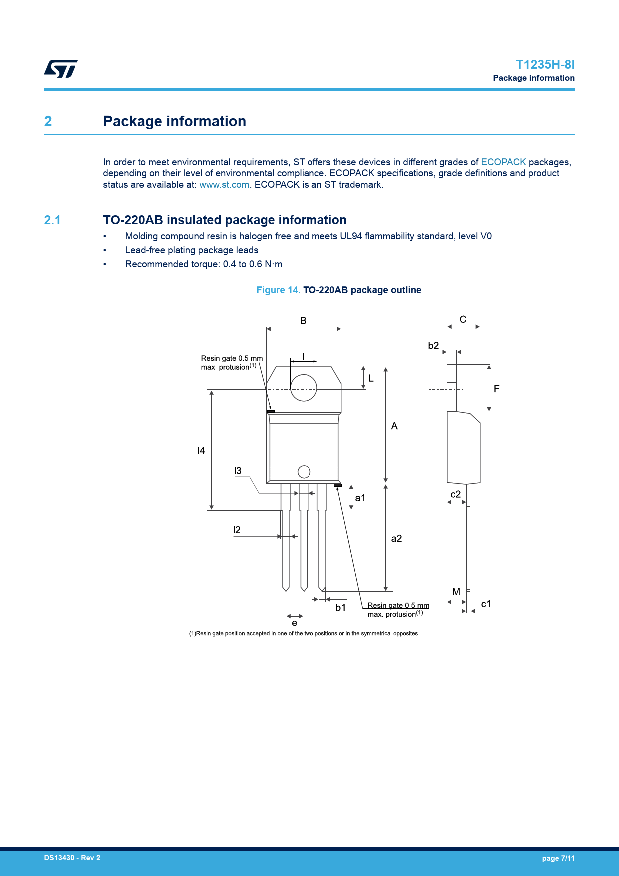 Pages / Page11 / 7 — T1235H-8I. Package information. 2.1. TO-220AB insulated package …