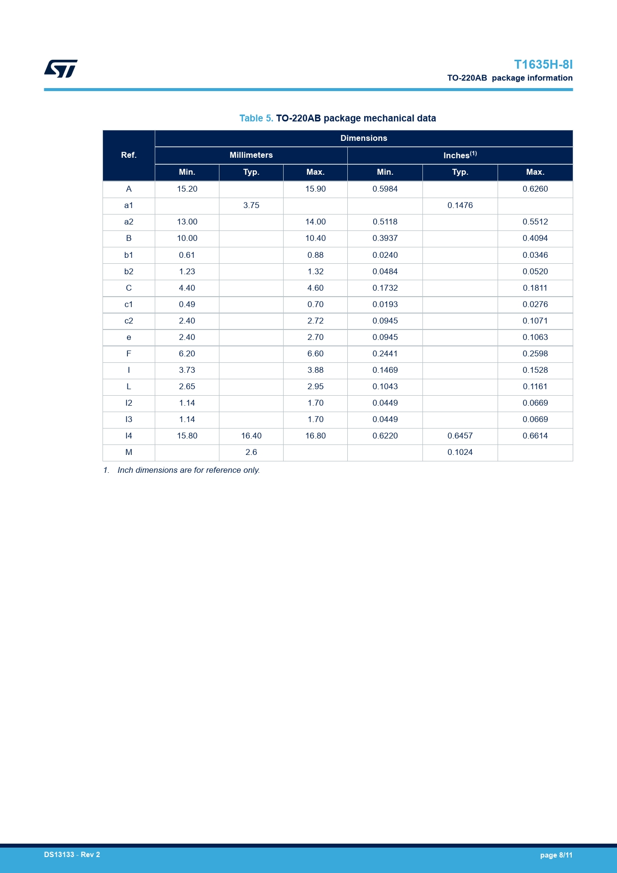 T1635H-8I TO-220AB package information Table 5. TO-220AB package mechanical data Dimensions Ref. Millimeters Inches(1) Min. Typ. Max. Min. Typ. Max.