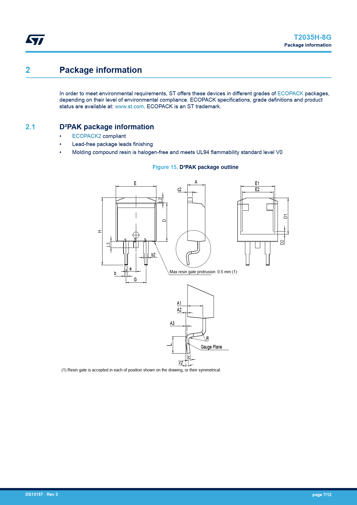 T2035H-8GPackage information2Package information In order to meet environmental requirements, ST offers these devices in different grades of ECOPACK packages, depending on their level of environmental compliance. ECOPACK specifications, grade definitions and product status are available at: www.st.com. ECOPACK is an ST trademark. 2.1D²PAK package information • ECOPACK2 compliant • Lead-free package leads finishing • Molding compound resin is halogen-free and meets UL94 flammability standard level V0 Figure 15. D²PAK package outline A E E1 c2 E2 L2 D1 D H 1 2 3 D2 L3 b2 e b Max resin gate protrusion: 0.5 mm (1) G A1 A2 A3 R L Gauge Plane c V2 (1) Resin gate is accepted in each of position shown on the drawing, or their symmetrical. DS13157 - Rev 3page 7/12 Document Outline 1 Characteristics 1.1 Characteristics (curves) 2 Package information 2.1 D²PAK package information 3 Ordering information Revision history