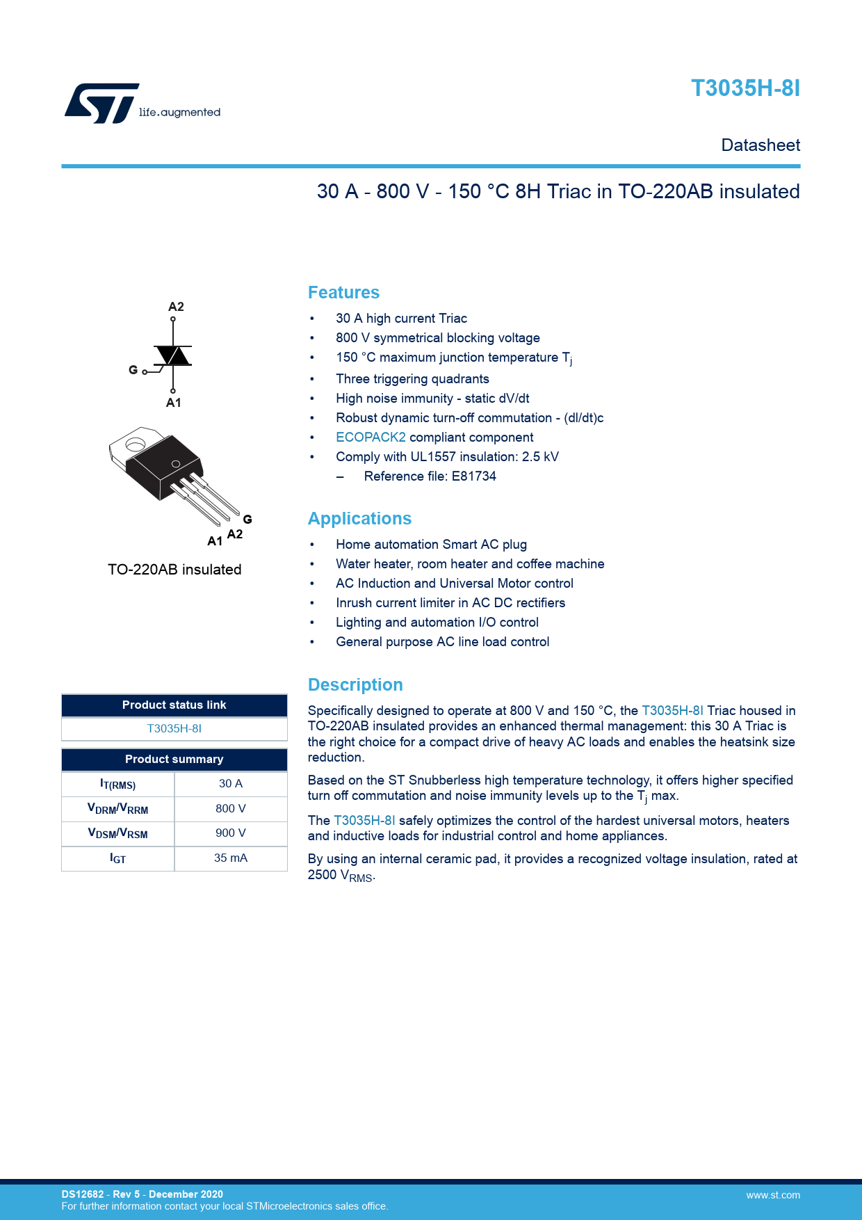T3035H-8I. Features. Applications. A1 A2. Description. Product status link. Product summary. T(RMS). VDRM/VRRM. VDSM/VRSM. IGT. DS12682. Rev 5