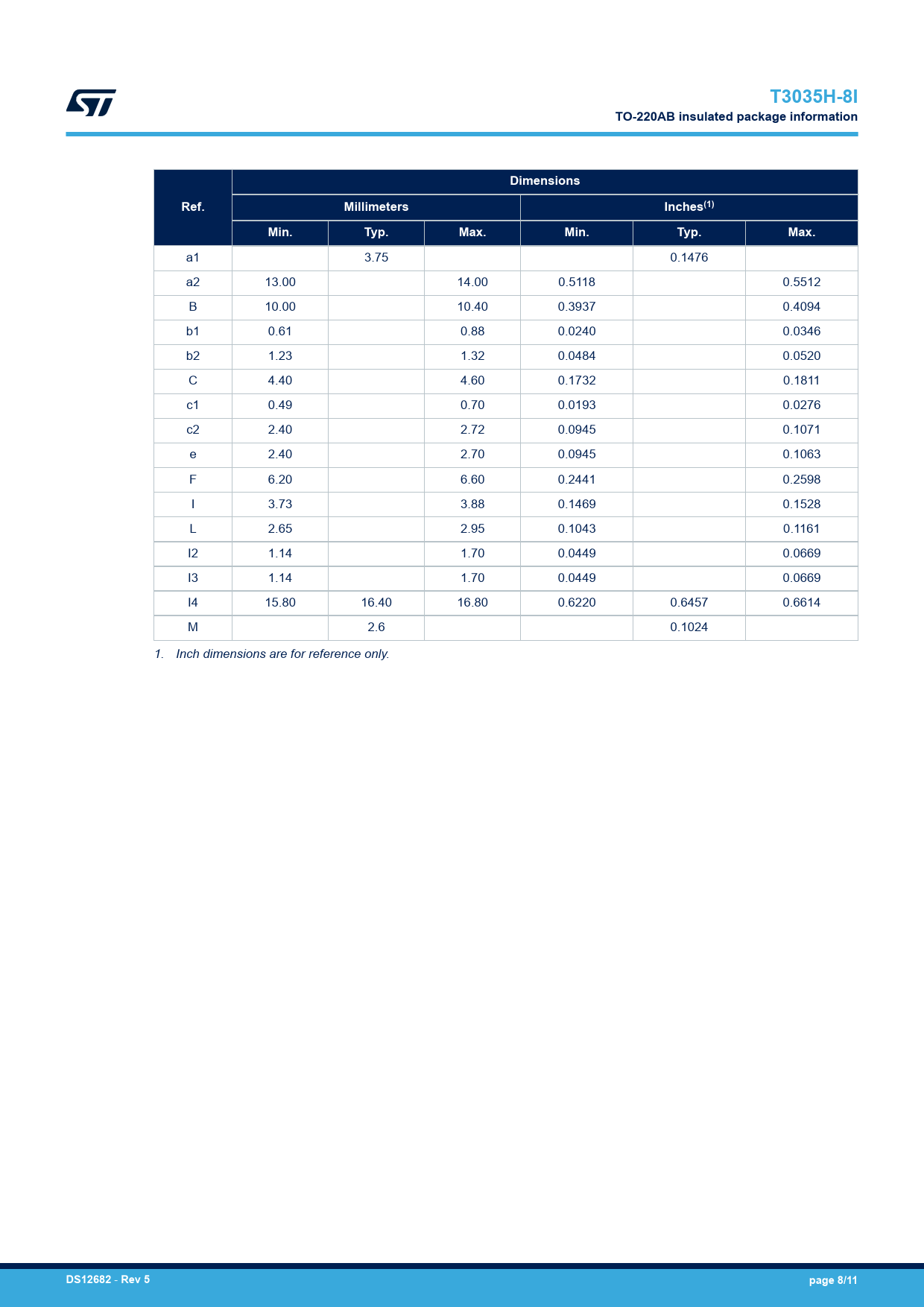 T3035H-8I. TO-220AB insulated package information. Dimensions. Ref. Millimeters. Inches(1). Min. Typ. Max. DS12682. Rev 5. page 8/11