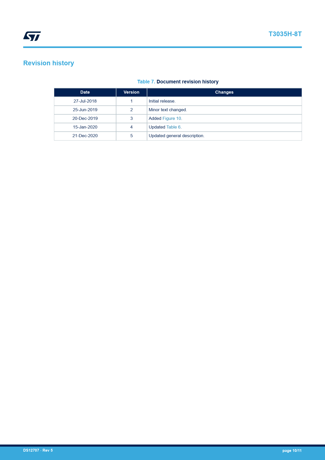 T3035H-8T. Revision history. Table 7. Document revision history. Date. Version. Changes. DS12707. Rev 5. page 10/11