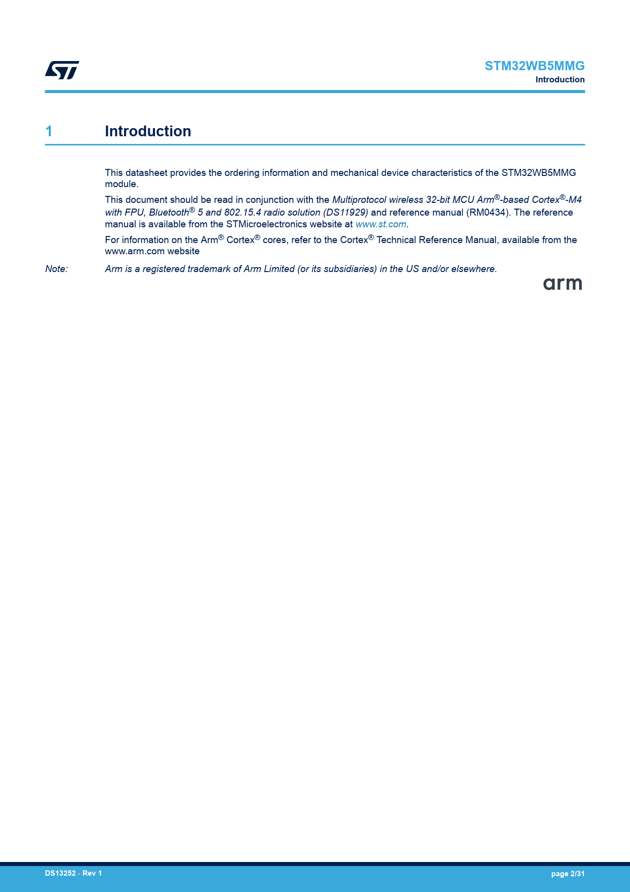 STM32WB5MMGIntroduction1Introduction This datasheet provides the ordering information and mechanical device characteristics of the STM32WB5MMG module. This document should be read in conjunction with the Multiprotocol wireless 32-bit MCU Arm®-based Cortex®-M4 with FPU, Bluetooth® 5 and 802.15.4 radio solution (DS11929) and reference manual (RM0434). The reference manual is available from the STMicroelectronics website at www.st.com. For information on the Arm® Cortex® cores, refer to the Cortex® Technical Reference Manual, available from the www.arm.com website Note: Arm is a registered trademark of Arm Limited (or its subsidiaries) in the US and/or elsewhere. DS13252 - Rev 1page 2/31 Document Outline 1 Introduction 2 Description 3 Available peripherals 4 Pin description 5 Recommendations 5.1 Pin recommendations 5.2 Layout recommendations 5.2.1 STM32WB5MMG placement 5.2.2 Enclosure effects 5.2.3 Ground plane 5.2.4 Sensitive GPIOs 5.2.5 Four layer reference board design 6 Electrical characteristics 6.1 Operating conditions 6.2 Power consumption 6.3 RF characteristics 6.4 Antenna radiation patterns and efficiency 7 Thermal characteristics 8 Solder re-flow recommendation 9 Package information 9.1 SiP-LGA86 package information 9.1.1 Device marking for SiP-LGA86 10 Ordering information 11 Tape and reel packing 12 Certification 12.1 CE certification 12.2 FCC certification 12.3 ISED certification 12.4 JRF certification 12.5 NCC certification 12.6 SRRC certification Revision history Contents List of tables List of figures