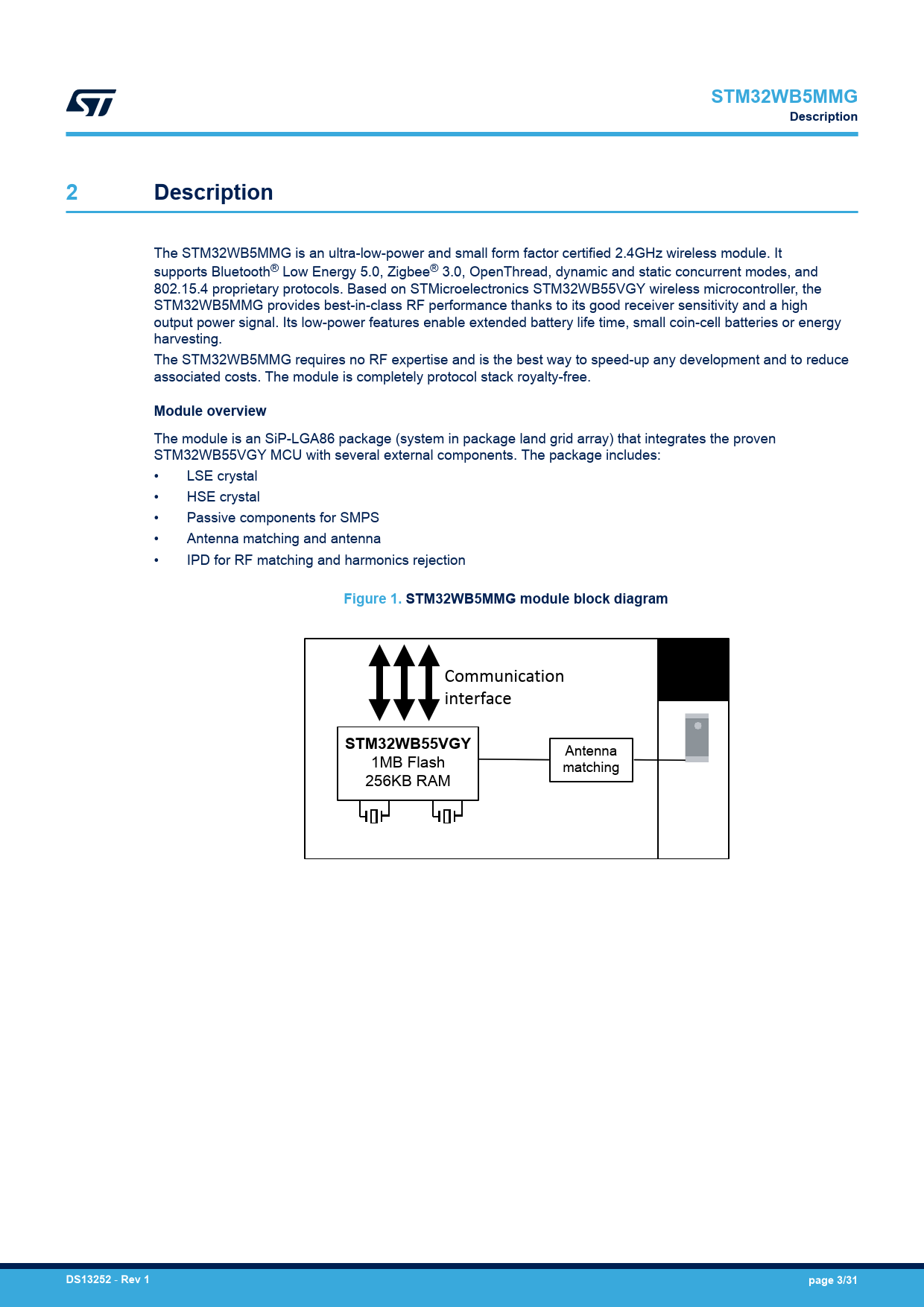 STM32WB5MMGDescription2Description The STM32WB5MMG is an ultra-low-power and small form factor certified 2.4GHz wireless module. It supports Bluetooth® Low Energy 5.0, Zigbee® 3.0, OpenThread, dynamic and static concurrent modes, and 802.15.4 proprietary protocols. Based on STMicroelectronics STM32WB55VGY wireless microcontroller, the STM32WB5MMG provides best-in-class RF performance thanks to its good receiver sensitivity and a high output power signal. Its low-power features enable extended battery life time, small coin-cell batteries or energy harvesting. The STM32WB5MMG requires no RF expertise and is the best way to speed-up any development and to reduce associated costs. The module is completely protocol stack royalty-free. Module overview The module is an SiP-LGA86 package (system in package land grid array) that integrates the proven STM32WB55VGY MCU with several external components. The package includes: • LSE crystal • HSE crystal • Passive components for SMPS • Antenna matching and antenna • IPD for RF matching and harmonics rejection Figure 1. STM32WB5MMG module block diagram Communication interface STM32WB55VGY Antenna 1MB Flash matching 256KB RAM DS13252 - Rev 1page 3/31 Document Outline 1 Introduction 2 Description 3 Available peripherals 4 Pin description 5 Recommendations 5.1 Pin recommendations 5.2 Layout recommendations 5.2.1 STM32WB5MMG placement 5.2.2 Enclosure effects 5.2.3 Ground plane 5.2.4 Sensitive GPIOs 5.2.5 Four layer reference board design 6 Electrical characteristics 6.1 Operating conditions 6.2 Power consumption 6.3 RF characteristics 6.4 Antenna radiation patterns and efficiency 7 Thermal characteristics 8 Solder re-flow recommendation 9 Package information 9.1 SiP-LGA86 package information 9.1.1 Device marking for SiP-LGA86 10 Ordering information 11 Tape and reel packing 12 Certification 12.1 CE certification 12.2 FCC certification 12.3 ISED certification 12.4 JRF certification 12.5 NCC certification 12.6 SRRC certification Revision history Contents List of tables List of figures