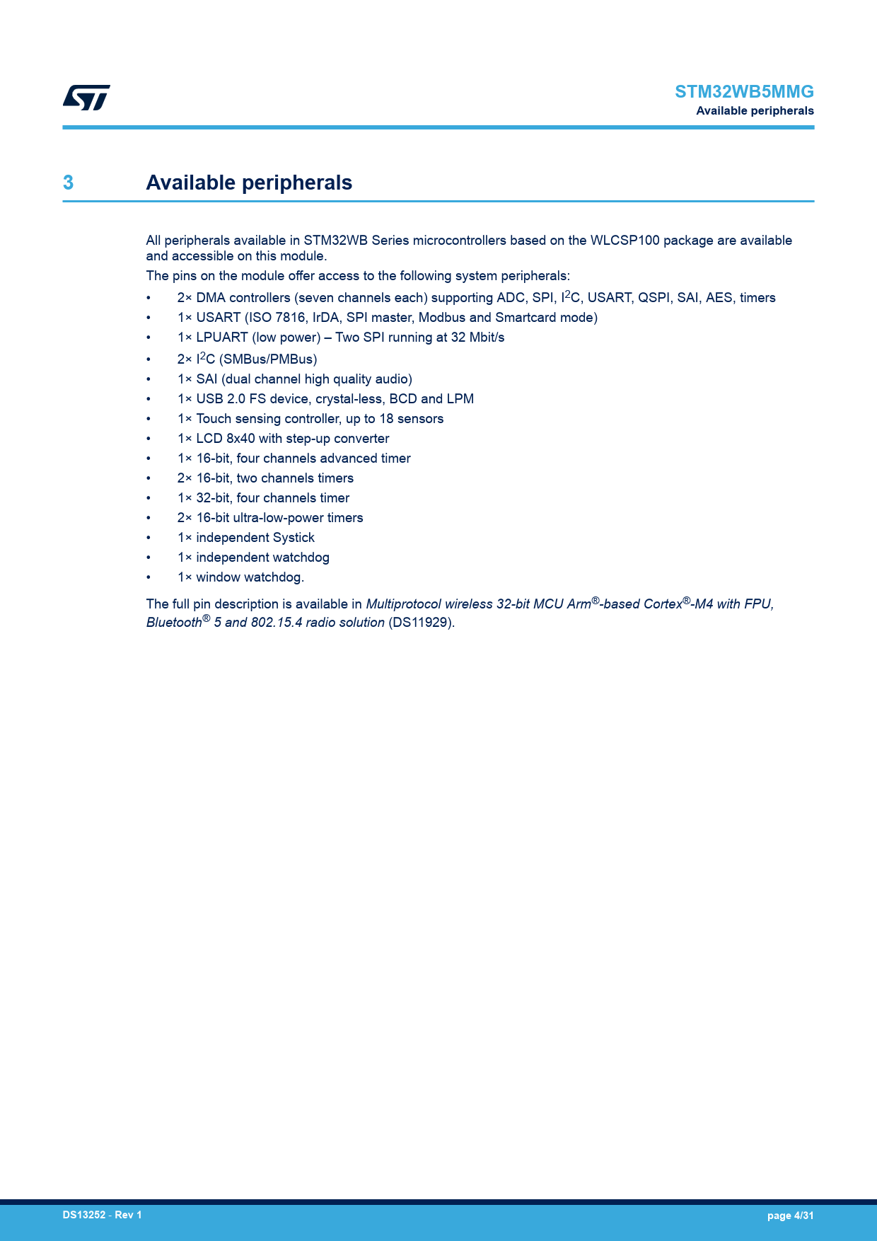 | Pages / Page | 31 / 4 — STM32WB5MMG. Available peripherals. DS13252. Rev 1. page 4/31 |