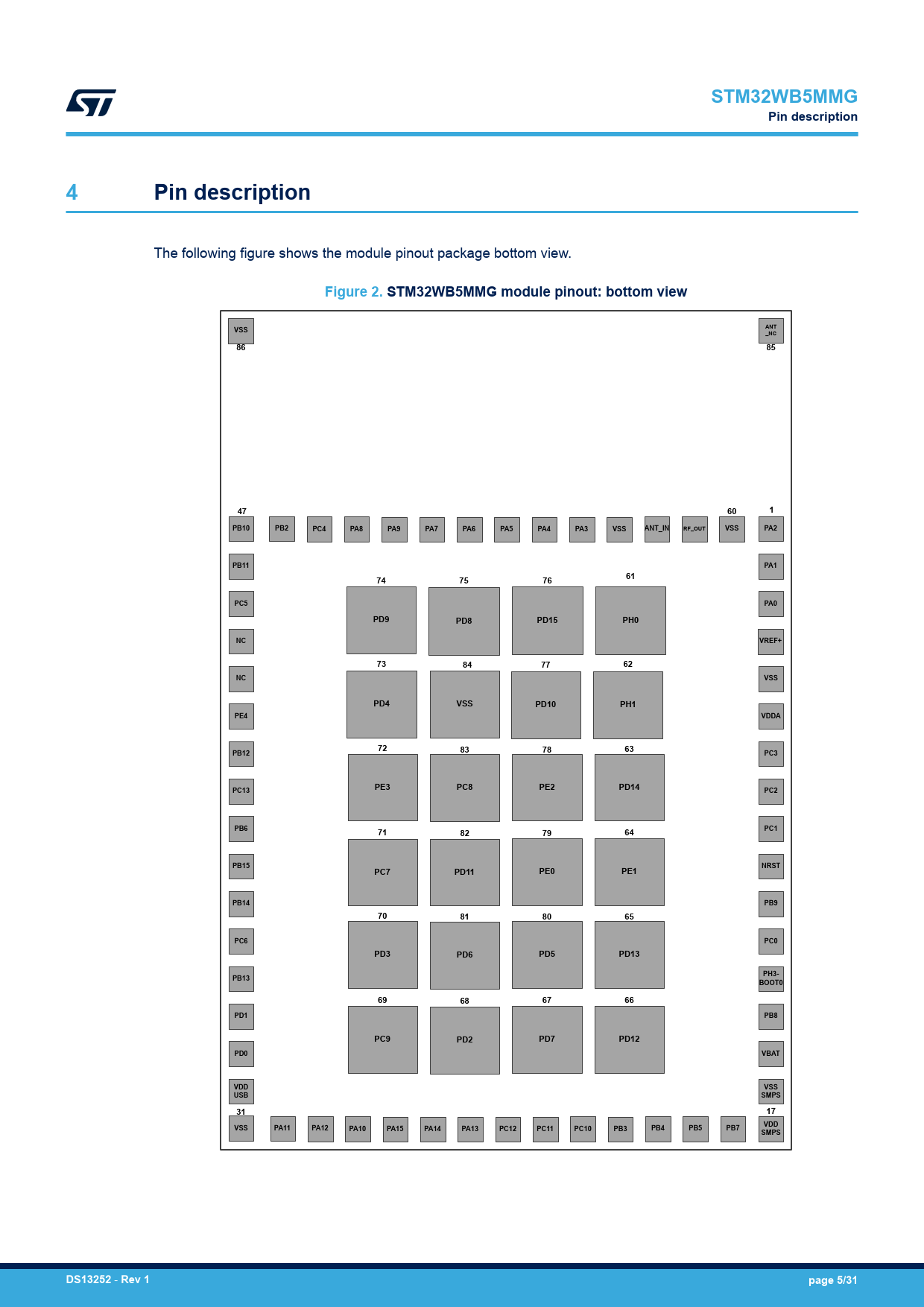 | Pages / Page | 31 / 5 — STM32WB5MMG. Pin description. Figure 2. STM32WB5MMG module pinout: bottom … |