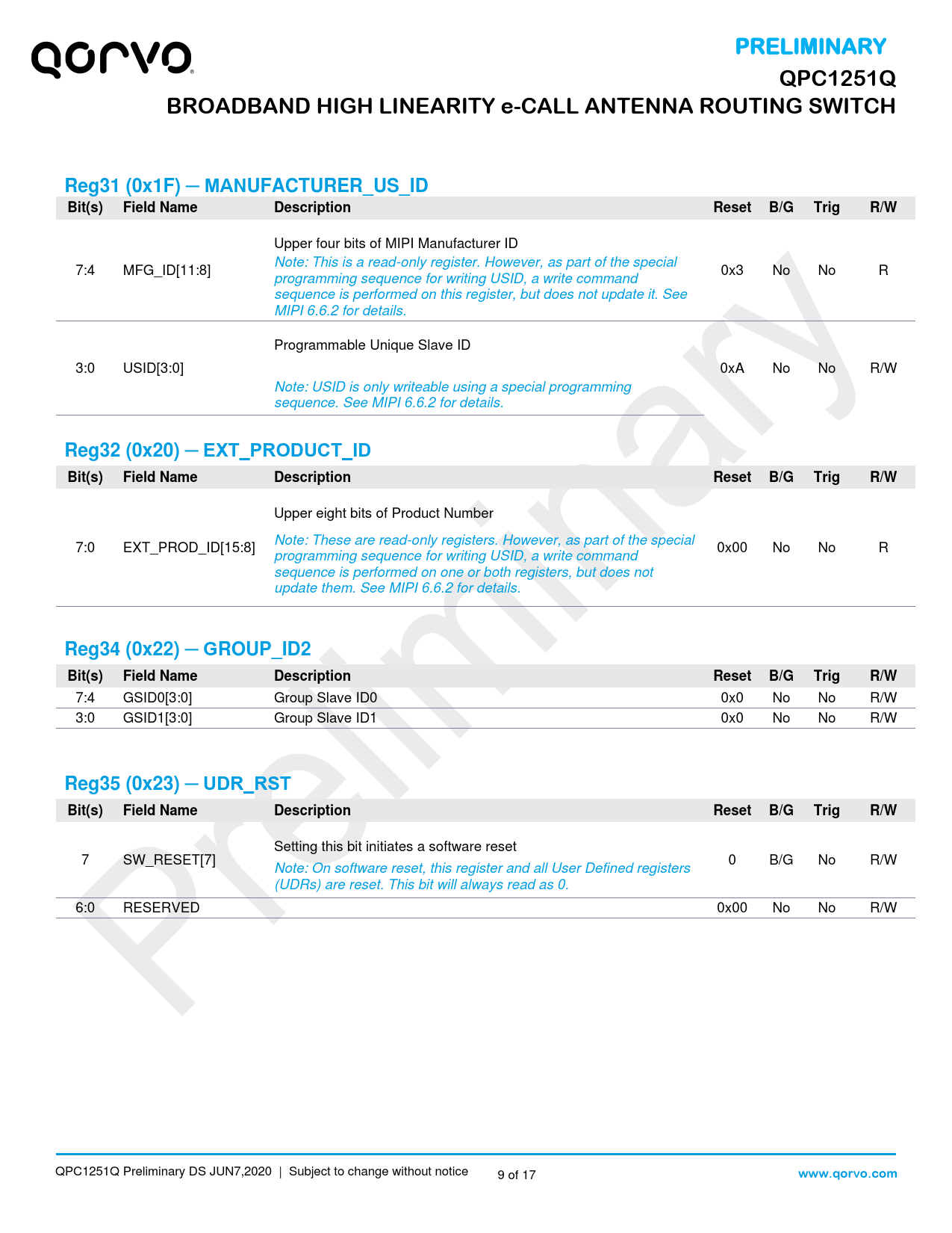 PRELIMINARY QPC1251Q BROADBAND HIGH LINEARITY e-CALL ANTENNA ROUTING SWITCH Reg31 (0x1F) ─ MANUFACTURER_US_ID Bit(s) Field Name Description Reset B/G Trig R/W