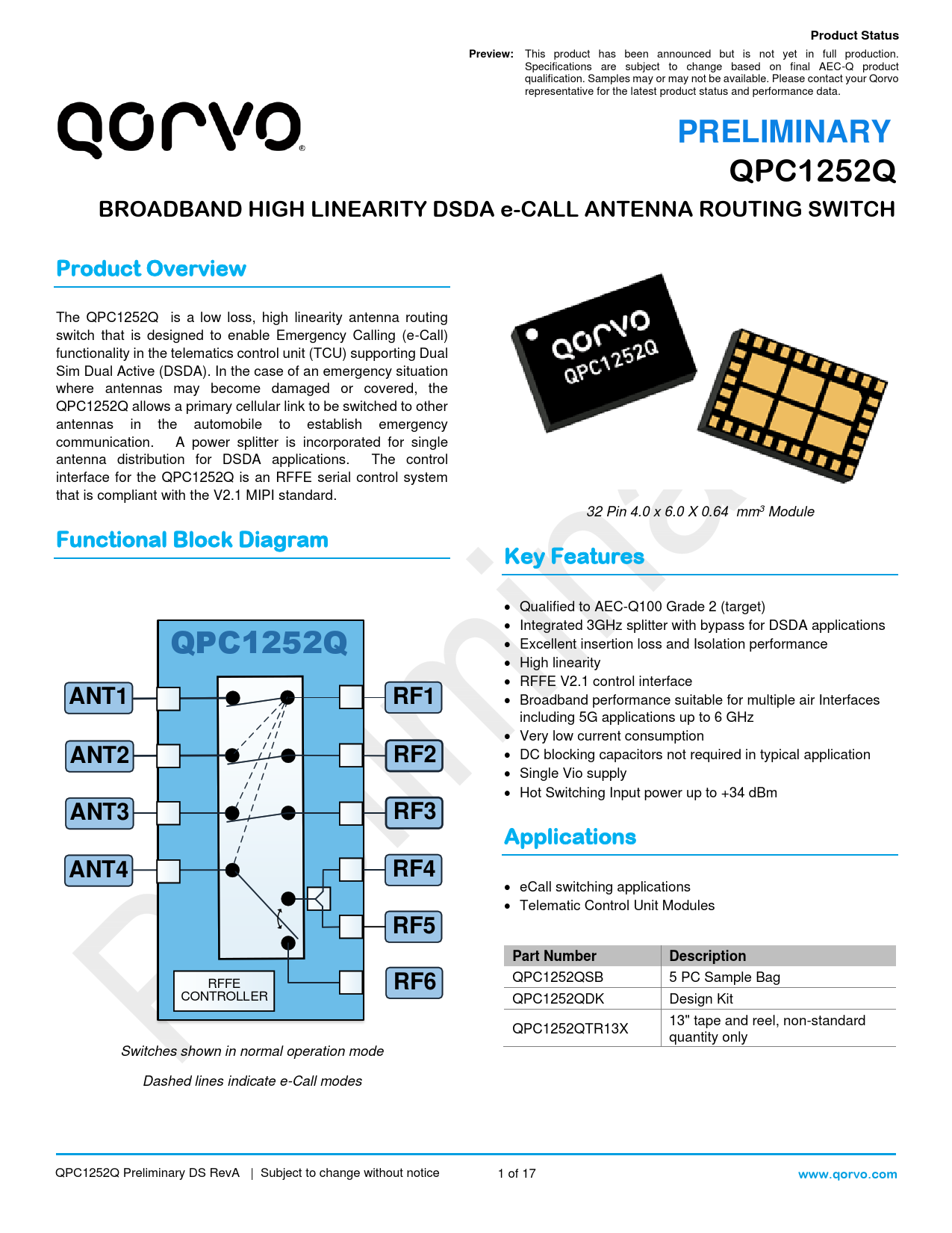 CONTROLLER QPC1252QDK Design Kit 13" tape and reel, non-standard QPC1252QTR13X quantity only Switches shown in normal operation mode Dashed lines indicate e-Call modes QPC1252Q Preliminary DS RevA | Subject to change without notice 1 of 17