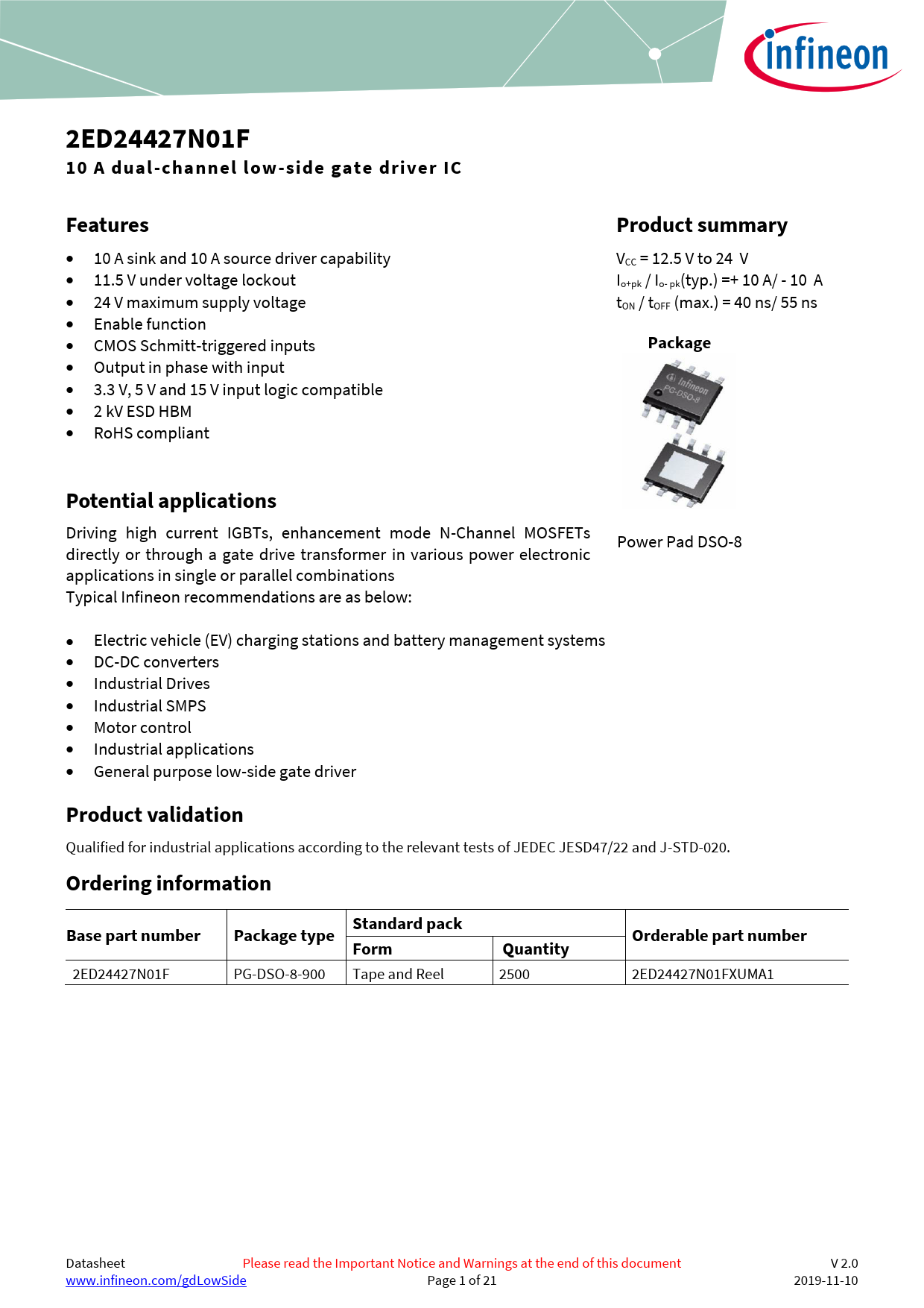 2ED24427N01F 10 A dual-channel low-side gate driver IC. Features. Product summary. Package. Potential applications