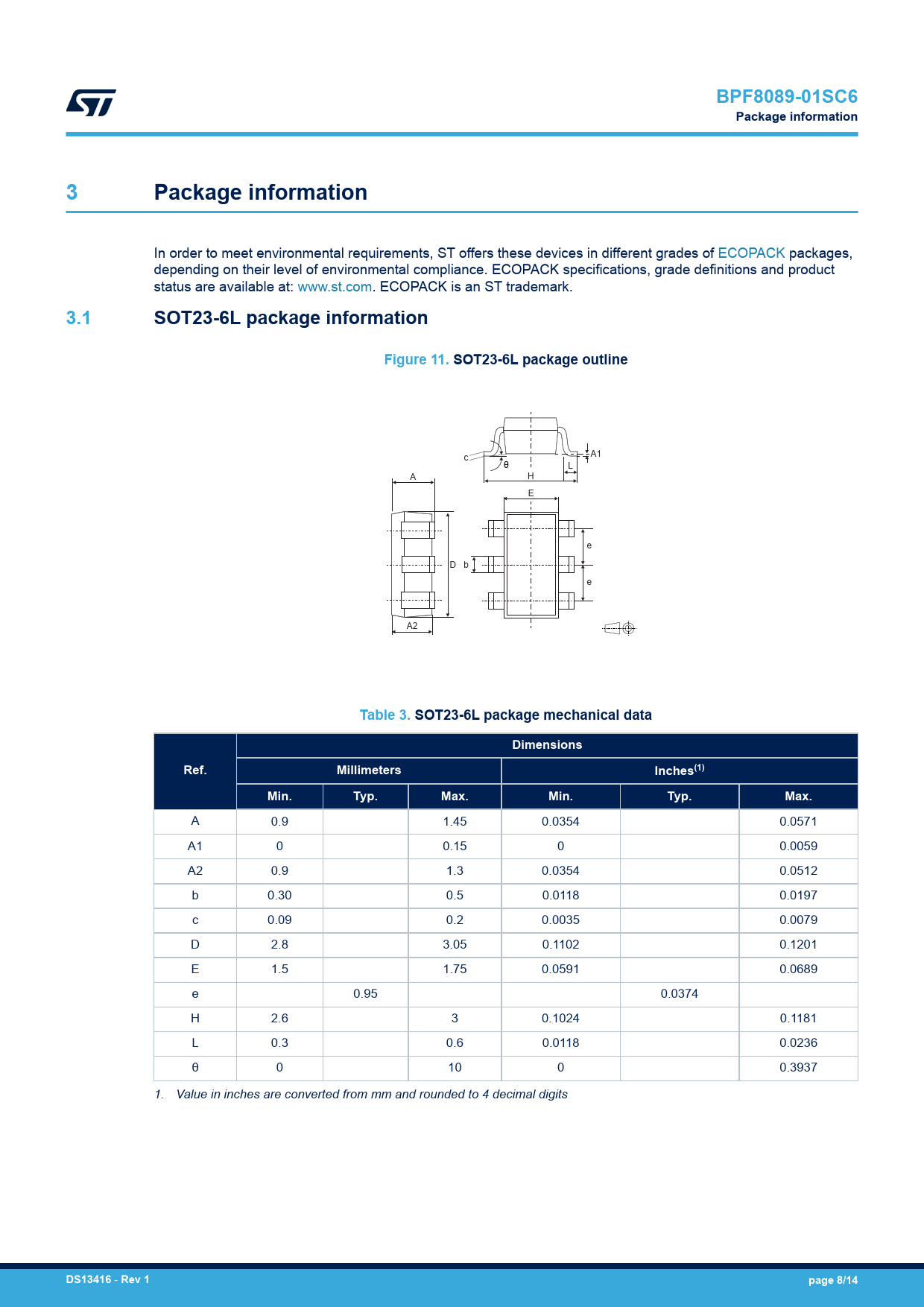 Pages / Page14 / 8 — BPF8089-01SC6. Package information. 3.1. SOT23-6L package information. …