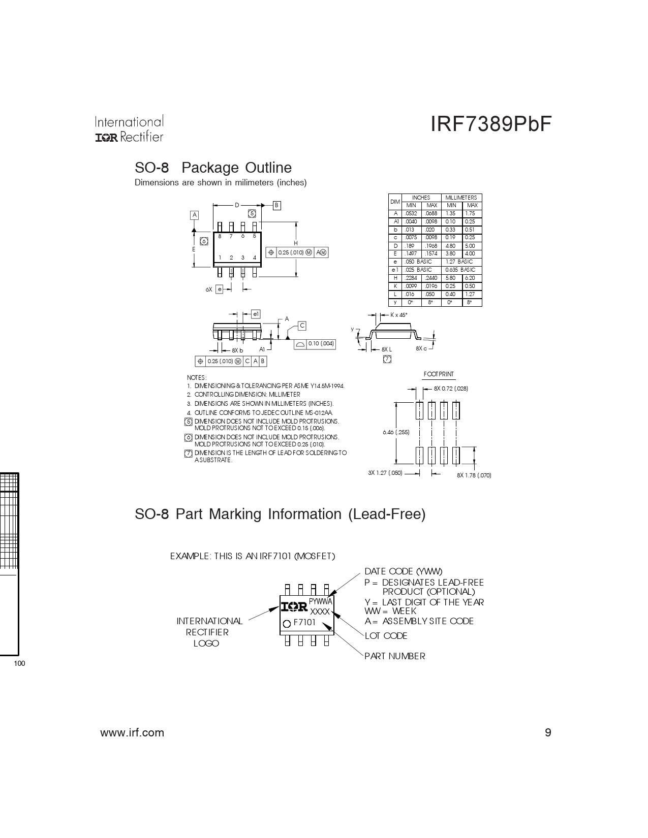 IRF7389PbF. SO-8. Package. Outline. Dimensions. are. shown. in. milimeters. (inches). INCHES. MILLIMETERS. DIM. D. B. MIN. MAX. MIN. MAX. 5. A. .0532. .0688. 1.35