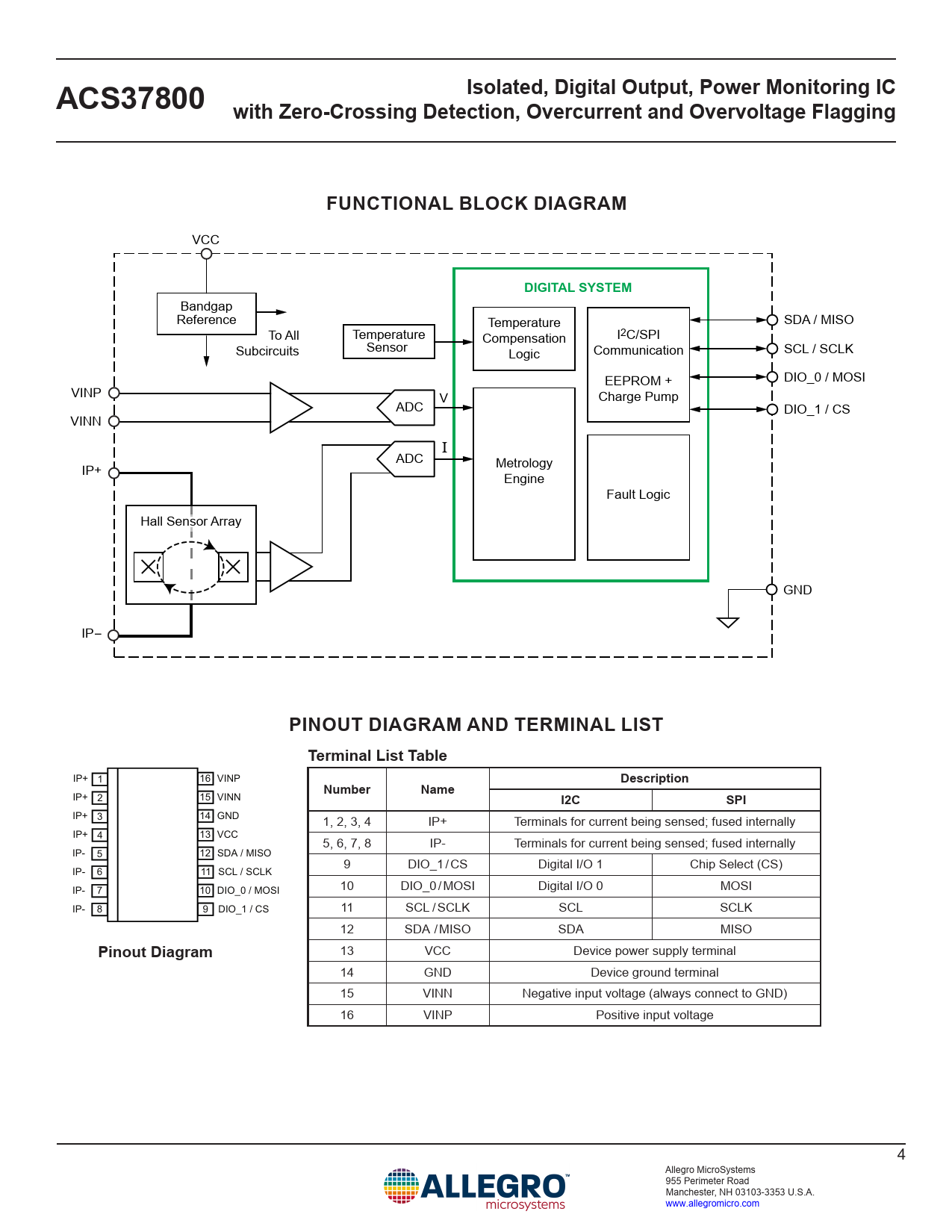 13 VCC Device power supply terminal 14 GND Device ground terminal 15 VINN Negative input voltage (always connect to GND) 16 VINP Positive input voltage 4 Allegro MicroSystems 955 Perimeter Road Manchester, NH 03103-3353 U.S.A. www.allegromicro.com Document Outline Features and Benefits Description Package Typical Application Selection Guide Absolute Maximum Ratings Isolation Characteristics ESD Ratings Thermal Characteristics Functional Block Diagram Pinout Diagram and Terminal List Electrical Characteristics 15B5 Performance Characteristics 30B3 Performance Characteristics 90B3 Performance Characteristics I2C Operating Characteristics SPI Operating Characteristics Theory of Operation Introduction Voltage and Current Measurements Overcurrent Measurement Path Trim Methods Power Calculations Operational Block Diagram Configurable Settings Configuring the DIO Pins (I2C Devices) Configuring the Device for AC Applications Device EEPROM Settings Voltage Measurement Current Measurement Configuring the Device for DC Applications Device EEPROM Settings Voltage Measurement Current Measurement RMS and Power Accuracy vs. Operation Point RMS and Power Output Error vs. Applied Input 15B5 IRMS and Power Error 30B3 IRMS and Power Error 90B3 IRMS and Power Error Digital Communication Communication Interfaces SPI Registers and EEPROM EEPROM Error Checking and Correction (ECC) I2C Slave Adressing EEPROM/Shadow Memory Map Register Details – EEPROM Volatile Memory Map Register Details - Volatile Application Information Thermal Rise vs. Primary Current ASEK37800 Evaluation Board Layout Recommended PCB Layout Package Outline Drawing