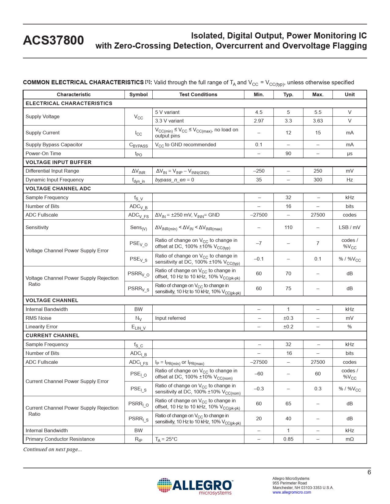 link to page 4 Isolated, Digital Output, Power Monitoring ICACS37800with Zero-Crossing Detection, Overcurrent and Overvoltage FlaggingCOMMON ELECTRICAL CHARACTERISTICS [1]: Valid through the full range of TA and VCC = VCC(typ), unless otherwise specified CharacteristicSymbolTest ConditionsMin.Typ.Max.UnitELECTRICAL CHARACTERISTICS 5 V variant 4.5 5 5.5 V Supply Voltage VCC 3.3 V variant 2.97 3.3 3.63 V Supply Current I VCC(min) ≤ VCC ≤ VCC(max), no load on CC output pins – 12 15 mA Supply Bypass Capacitor CBYPASS VCC to GND recommended 0.1 – – mA Power-On Time tPO – 90 – µs VOLTAGE INPUT BUFFER Differential Input Range ΔVINR ΔVIN = VINP – VINN(GND) –250 – 250 mV Dynamic Input Frequency fdyn_in bypass_n_en = 0 35 – 300 Hz VOLTAGE CHANNEL ADC Sample Frequency fS_V – 32 – kHz Number of Bits ADCV_B – 16 – bits ADC Fullscale ADCV_FS ΔVIN = ±250 mV, VINN= GND –27500 – 27500 codes Sensitivity Sens(V) ΔVINR(min) < ΔVIN < ΔVINR(max) – 110 – LSB / mV PSE Ratio of change on VCC to change in V_O offset at DC, 100% ±10% V –7 – 7 codes / %V Voltage Channel Power Supply Error CC(typ) CC PSE Ratio of change on VCC to change in V_S sensitivity at DC, 100% ±10% V –0.1 – 0.1 % / %VCC CC(typ) PSRR Ratio of change on VCC to change in 60 70 – dB Voltage Channel Power Supply Rejection V_O offset, 10 Hz to 10 kHz, 10% VCC(pk-pk) Ratio PSRR Ratio of change on VCC to change in V_S sensitivity, 10 Hz to 10 kHz, 10% V 60 75 – dB CC(pk-pk) VOLTAGE CHANNEL Internal Bandwidth BW – 1 – kHz RMS Noise NV Input referred – ±0.3 – mV Linearity Error ELIN_V – ±0.2 – % CURRENT CHANNEL Sample Frequency fS_C – 32 – kHz Number of Bits ADCI_B – 16 – bits ADC Fullscale ADCI_FS IP = IPR(min) or IPR(max) –27500 – 27500 codes PSE Ratio of change on VCC to change in I_O offset at DC, 100% ±10% V –60 – 60 codes / %V Current Channel Power Supply Error CC(nom) CC PSE Ratio of change on VCC to change in I_S sensitivity at DC, 100% ±10% V –0.3 – 0.3 % / %VCC CC(nom) PSRR Ratio of change on VCC to change in 60 65 – dB Current Channel Power Supply Rejection I_O offset, 10 Hz to 10 kHz, 10% VCC(pk-pk) Ratio PSRR Ratio of change on VCC to change in I_S sensitivity, 10 Hz to 10 kHz, 10% V 20 40 – dB CC(pk-pk) Internal Bandwidth BW – 1 – kHz Primary Conductor Resistance RIP TA = 25°C – 0.85 – mΩ Continued on next page... 6 Allegro MicroSystems 955 Perimeter Road Manchester, NH 03103-3353 U.S.A. www.allegromicro.com Document Outline Features and Benefits Description Package Typical Application Selection Guide Absolute Maximum Ratings Isolation Characteristics ESD Ratings Thermal Characteristics Functional Block Diagram Pinout Diagram and Terminal List Electrical Characteristics 15B5 Performance Characteristics 30B3 Performance Characteristics 90B3 Performance Characteristics I2C Operating Characteristics SPI Operating Characteristics Theory of Operation Introduction Voltage and Current Measurements Overcurrent Measurement Path Trim Methods Power Calculations Operational Block Diagram Configurable Settings Configuring the DIO Pins (I2C Devices) Configuring the Device for AC Applications Device EEPROM Settings Voltage Measurement Current Measurement Configuring the Device for DC Applications Device EEPROM Settings Voltage Measurement Current Measurement RMS and Power Accuracy vs. Operation Point RMS and Power Output Error vs. Applied Input 15B5 IRMS and Power Error 30B3 IRMS and Power Error 90B3 IRMS and Power Error Digital Communication Communication Interfaces SPI Registers and EEPROM EEPROM Error Checking and Correction (ECC) I2C Slave Adressing EEPROM/Shadow Memory Map Register Details – EEPROM Volatile Memory Map Register Details - Volatile Application Information Thermal Rise vs. Primary Current ASEK37800 Evaluation Board Layout Recommended PCB Layout Package Outline Drawing