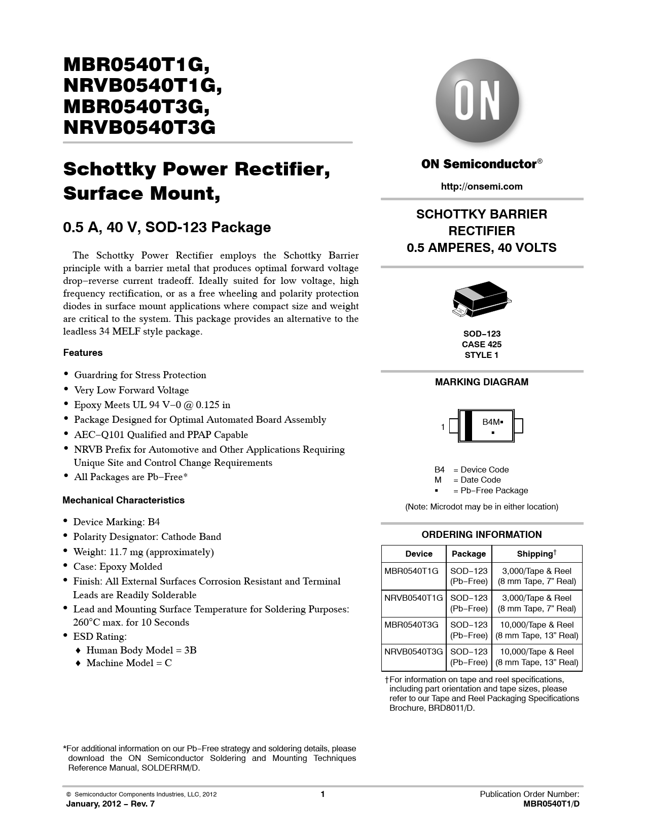† Case: Epoxy Molded MBR0540T1G SOD−123 3,000/Tape & Reel Finish: All External Surfaces Corrosion Resistant and Terminal (Pb−Free) (8 mm Tape, 7” Real) Leads are Readily Solderable NRVB0540T1G SOD−123 3,000/Tape & Reel Lead and Mounting Surface Temperature for Soldering Purposes: (Pb−Free) (8 mm Tape, 7” Real) 260C max. for 10 Seconds MBR0540T3G SOD−123 10,000/Tape & Reel ESD Rating: (Pb−Free) (8 mm Tape, 13” Real)  Human Body Model = 3B NRVB0540T3G SOD−123 10,000/Tape & Reel  Machine Model = C (Pb−Free) (8 mm Tape, 13” Real) †For information on tape and reel specifications, including part orientation and tape sizes, please refer to our Tape and Reel Packaging Specifications Brochure, BRD8011/D. *For additional information on our Pb−Free strategy and soldering details, please download the ON Semiconductor Soldering and Mounting Techniques Reference Manual, SOLDERRM/D.  Semiconductor Components Industries, LLC, 2012