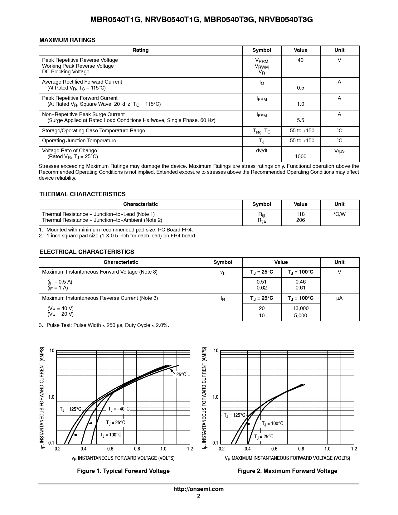 link to page 2 link to page 2 link to page 2 link to page 2 MBR0540T1G, NRVB0540T1G, MBR0540T3G, NRVB0540T3GMAXIMUM RATINGSRatingSymbolValueUnit Peak Repetitive Reverse Voltage VRRM 40 V Working Peak Reverse Voltage VRWM DC Blocking Voltage VR Average Rectified Forward Current IO A (At Rated VR, TC = 115C) 0.5 Peak Repetitive Forward Current IFRM A (At Rated VR, Square Wave, 20 kHz, TC = 115C) 1.0 Non−Repetitive Peak Surge Current IFSM A (Surge Applied at Rated Load Conditions Halfwave, Single Phase, 60 Hz) 5.5 Storage/Operating Case Temperature Range Tstg, TC −55 to +150 C Operating Junction Temperature TJ −55 to +150 C Voltage Rate of Change dv/dt V/ms (Rated VR, TJ = 25C) 1000 Stresses exceeding Maximum Ratings may damage the device. Maximum Ratings are stress ratings only. Functional operation above the Recommended Operating Conditions is not implied. Extended exposure to stresses above the Recommended Operating Conditions may affect device reliability. THERMAL CHARACTERISTICSCharacteristicSymbolValueUnit Thermal Resistance − Junction−to−Lead (Note 1) Rtjl 118 C/W Thermal Resistance − Junction−to−Ambient (Note 2) Rtja 206 1. Mounted with minimum recommended pad size, PC Board FR4. 2. 1 inch square pad size (1 X 0.5 inch for each lead) on FR4 board. ELECTRICAL CHARACTERISTICSCharacteristicSymbolValueUnit Maximum Instantaneous Forward Voltage (Note 3) vF TJ = 25CTJ = 100C V (iF = 0.5 A) 0.51 0.46 (iF = 1 A) 0.62 0.61 Maximum Instantaneous Reverse Current (Note 3) IR TJ = 25CTJ = 100C mA (VR = 40 V) 20 13,000 (VR = 20 V) 10 5,000 3. Pulse Test: Pulse Width 250 ms, Duty Cycle 2.0%. 100 10 10 (AMPS) (AMPS) 25C ARD CURRENT ARD CURRENT W 1.0 W 1.0 TJ = 125C TJ = -40C TJ = 125C ANEOUS FOR TJ = 25C ANEOUS FOR TJ = 100C ANT ANT TJ = 100C TJ = 25C , INST 0.1 , INST 0.1 i F 0.2 0.4 0.6 0.8 1.0 1.2 I F 0.2 0.4 0.6 0.8 1.0 1.2 vF, INSTANTANEOUS FORWARD VOLTAGE (VOLTS) VF, MAXIMUM INSTANTANEOUS FORWARD VOLTAGE (VOLTS) Figure 1. Typical Forward VoltageFigure 2. Maximum Forward Voltagehttp://onsemi.com2