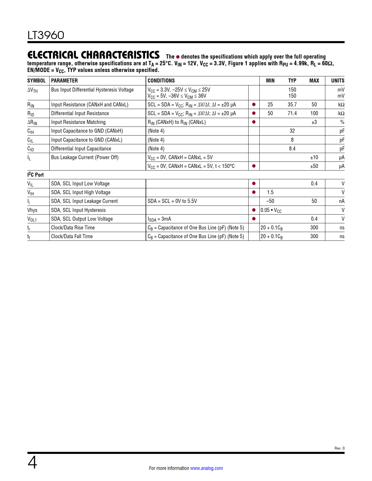 ∆VTH Bus Input Differential Hysteresis Voltage VCC = 3.3V, –25V ≤ VCM ≤ 25V 150 mV VCC = 5V, –36V ≤ VCM ≤ 36V 150 mV RIN Input Resistance (CANxH and CANxL) SCL = SDA = VCC; RIN = ∆V/∆I; ∆I = ±20 µA l 25 35.7 50 kΩ RID Differential Input Resistance SCL = SDA = VCC; RIN = ∆V/∆I; ∆I = ±20 µA l 50 71.4 100 kΩ ∆RIN Input Resistance Matching RIN (CANxH) to RIN (CANxL) l ±3 % CIH Input Capacitance to GND (CANxH) (Note 4) 32 pF CIL Input Capacitance to GND (CANxL) (Note 4) 8 pF CID Differential Input Capacitance (Note 4) 8.4 pF IL Bus Leakage Current (Power Off) VCC = 0V, CANxH = CANxL = 5V ±10 µA VCC = 0V, CANxH = CANxL = 5V, t < 150°C l ±50 µA