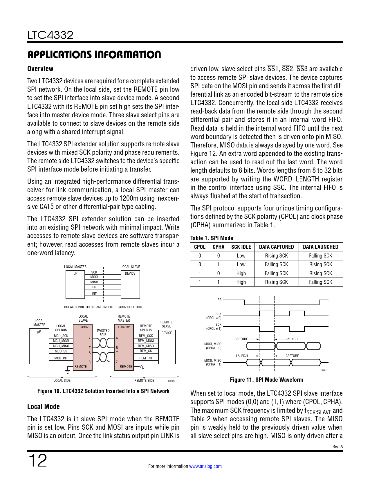 one-word latency. 0 0 Low Rising SCK Falling SCK 0 1 Low Falling SCK Rising SCK LOCAL MASTER LOCAL SLAVE SCK µP DEVICE 1 0 High Falling SCK Rising SCK MOSI MISO 1 1 High Rising SCK Falling SCK SS INT SS BREAK CONNECTIONS AND INSERT LTC4332 SOLUTION SCK LOCAL REMOTE (CPOL = 0) LOCAL SLAVE MASTER REMOTE MASTER SCK LOCAL LTC4332 LTC4332 REMOTE SLAVE (CPOL = 1) µP SPI BUS TWISTED SPI BUS DEVICE MCU_SCK PAIR REM_SCK Y A CAPTURE LAUNCH MCU_MOSI REM_MOSI MOSI, MISO MCU_MISO REM_MISO Z B (CPHA = 0) MCU_SS REM_SS A Y LAUNCH CAPTURE MCU_INT REM_INT MOSI, MISO B Z (CPHA = 1) REMOTE REMOTE V L 4332 F11 LOCAL SIDE REMOTE SIDE 4332 F10