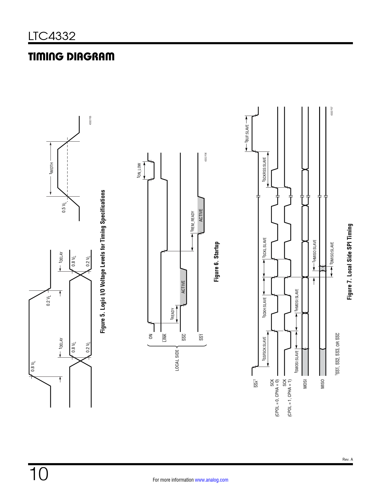 LTC4332 TIMING DIAGRAM 4332 F07 4332 F05 VE t BUF:SLA 4332 F06 VE t WIDTH t ON_LOW t SCKRSS:SLA L 0.5 V ACTIVE t REM_READY iming Specificationsiming VE VE VE Y L L Startup t SCKL:SLA t DELA t HMISO:SLA 0.8 V 0.2 V t DMISO:SLA Local Side SPI Toltage Levels for TFigure 6. ACTIVE VE L VE Figure 7. 0.2 V Logic I/O V t HMOSI:SLA t READY t SCKH:SLA Figure 5. Y ON VE SSC L L LINK SSC SS1 t DELA , OR 0.8 V 0.2 V VE , SS3 L t SSFSCK:SLA , SS2 0.8 V LOCAL SIDE t SMOSI:SLA SS11 1 SSx SCK SCK MOSI MISO (CPOL = 0, CPHA = 0) (CPOL = 1, CPHA = 1) Rev. A 10 For more information www.analog.com Document Outline Features Applications Typical Application Description Absolute Maximum Ratings Order Information Electrical Characteristics Pin Configuration Switching Characteristics Typical Performance Characteristics Pin Functions Block Diagram Test Circuits Timing Diagram Applications Information Package Description Typical Application Related Parts