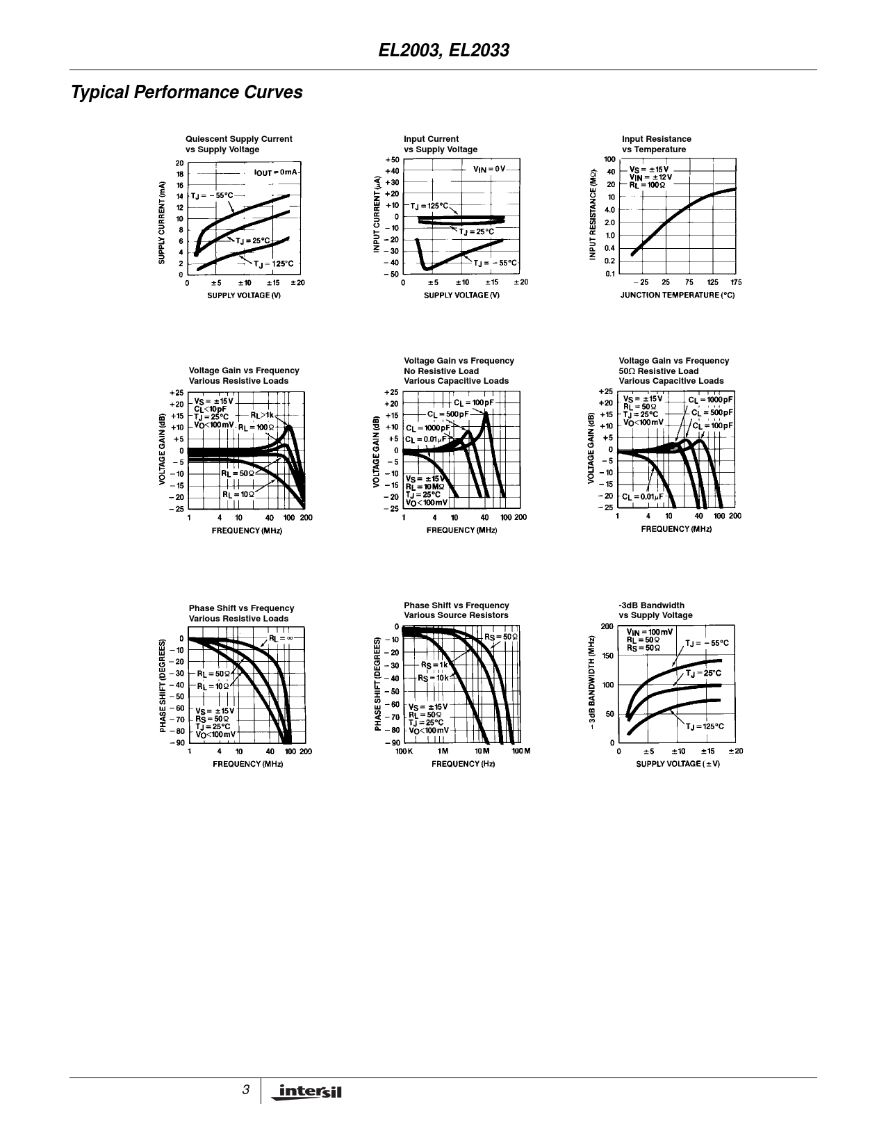 EL2003, EL2033 Typical Performance Curves Quiescent Supply Current Input Current Input Resistance vs Supply Voltage vs Supply Voltage vs Temperature Voltage Gain vs Frequency Voltage Gain vs Frequency Voltage Gain vs Frequency No Resistive Load 50