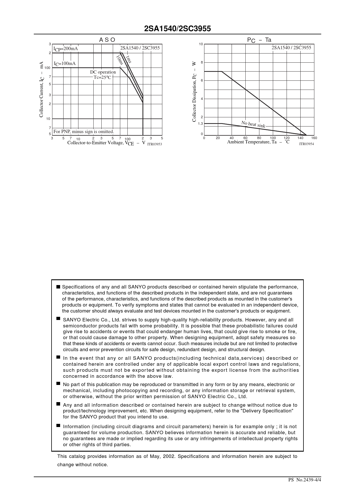 A S O PC -- Ta 3 10 I 2SA1540 / 2SC3955 2SA1540 / 2SC3955 CP=200mA 2 10ms 1ms 8 A IC=100mA 100 –W –m DC operation 7 C Tc=25°C P I C 6 5 3 4 2 Collector Current, 2 10 Collector Dissipation, 1.3 No heat sink 7 For PNP, minus sign is omitted. 5 0 3 5 7 2 3 5 7 2 3 5 10 100 0 20 40 60 80 100 120 140 160 Collector-to-Emitter Voltage, V Ambient Temperature, Ta – ˚C CE – V ITR03953 ITR03954 Specifications of any and all SANYO products described or contained herein stipulate the performance, characteristics, and functions of the described products in the independent state, and are not guarantees of the performance, characteristics, and functions of the described products as mounted in the customer's products or equipment. To verify symptoms and states that cannot be evaluated in an independent device, the customer should always evaluate and test devices mounted in the customer's products or equipment. SANYO Electric Co., Ltd. strives to supply high-quality high-reliability products. However, any and all semiconductor products fail with some probability. It is possible that these probabilistic failures could give rise to accidents or events that could endanger human lives, that could give rise to smoke or fire, or that could cause damage to other property. When designing equipment, adopt safety measures so that these kinds of accidents or events cannot occur. Such measures include but are not limited to protective circuits and error prevention circuits for safe design, redundant design, and structural design. In the event that any or all SANYO products(including technical data,services) described or contained herein are controlled under any of applicable local export control laws and regulations, such products must not be expor ted without obtaining the expor t license from the author ities concerned in accordance with the above law. No part of this publication may be reproduced or transmitted in any form or by any means, electronic or mechanical, including photocopying and recording, or any information storage or retrieval system, or otherwise, without the prior written permission of SANYO Electric Co. , Ltd. Any and all information described or contained herein are subject to change without notice due to product/technology improvement, etc. When designing equipment, refer to the "Delivery Specification" for the SANYO product that you intend to use. Information (including circuit diagrams and circuit parameters) herein is for example only ; it is not guaranteed for volume production. SANYO believes information herein is accurate and reliable, but no guarantees are made or implied regarding its use or any infringements of intellectual property rights or other rights of third parties. This catalog provides information as of May, 2002. Specifications and information herein are subject to change without notice. PS No.2439-4/4
