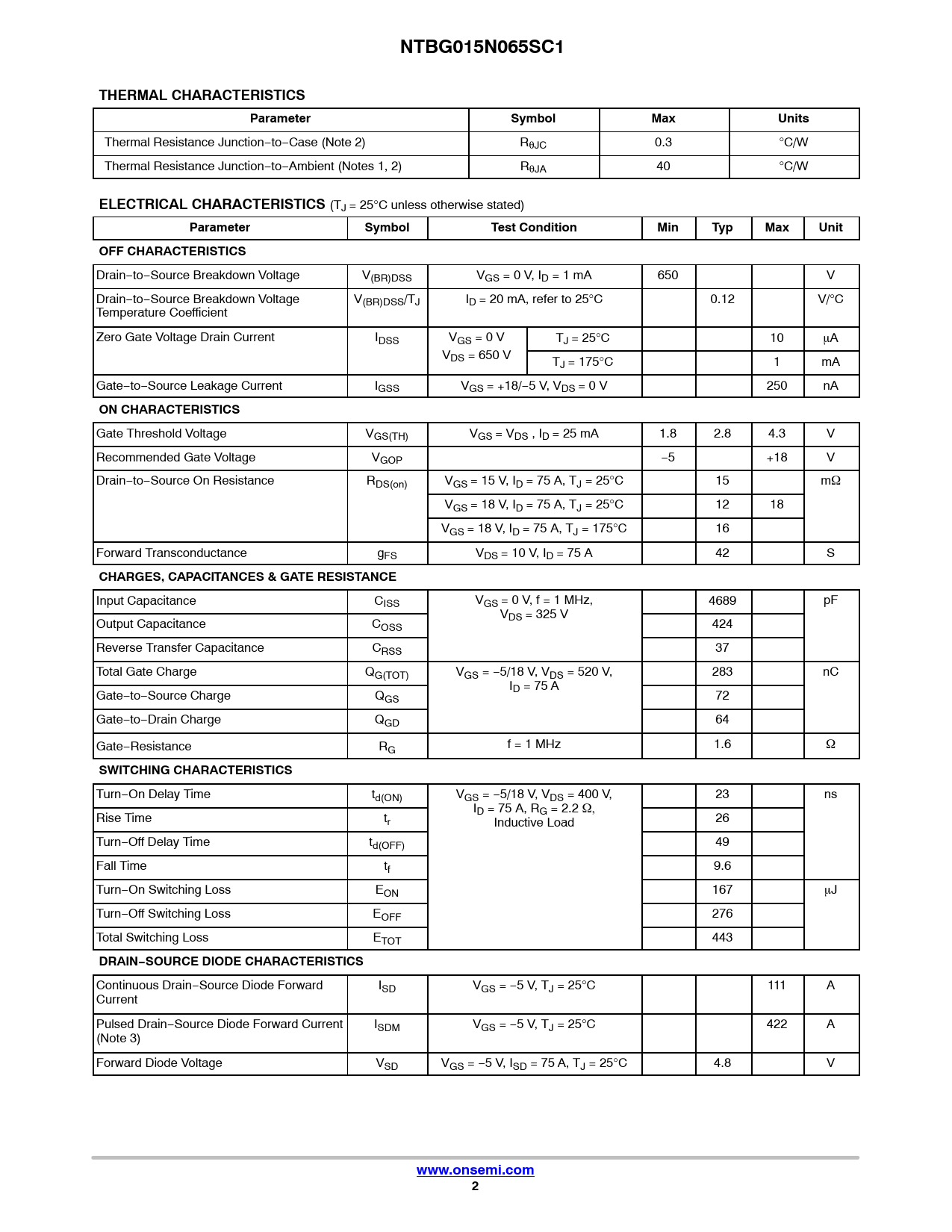 NTBG015N065SC1. THERMAL CHARACTERISTICS. Parameter. Symbol. Max. Units. ELECTRICAL CHARACTERISTICS. Test Condition. Min. Typ. Unit