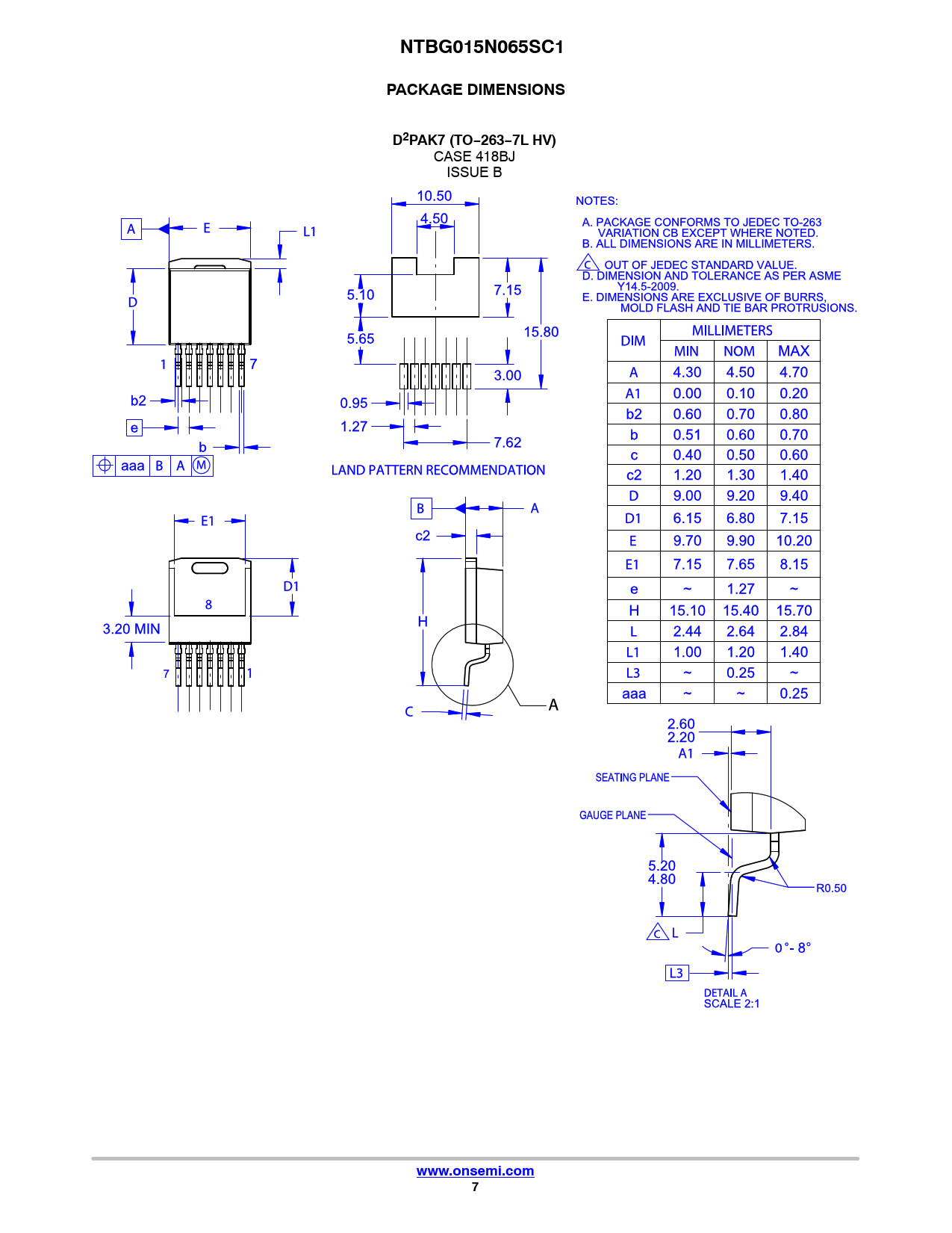 | Pages / Page | 8 / 7 — NTBG015N065SC1. PACKAGE DIMENSIONS. D2PAK7 (TO−263−7L HV). www.onsemi.com |