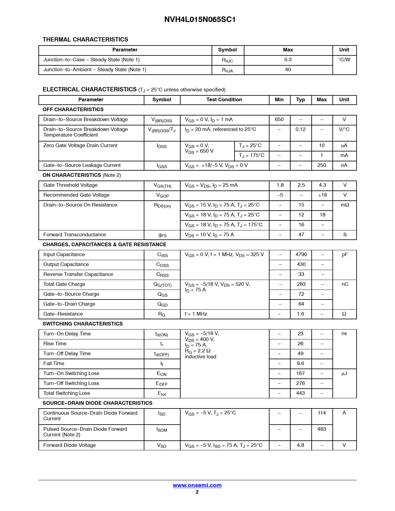 NVH4L015N065SC1. THERMAL CHARACTERISTICS. Parameter. Symbol. Max. Unit. ELECTRICAL CHARACTERISTICS. Test Condition. Min. Typ