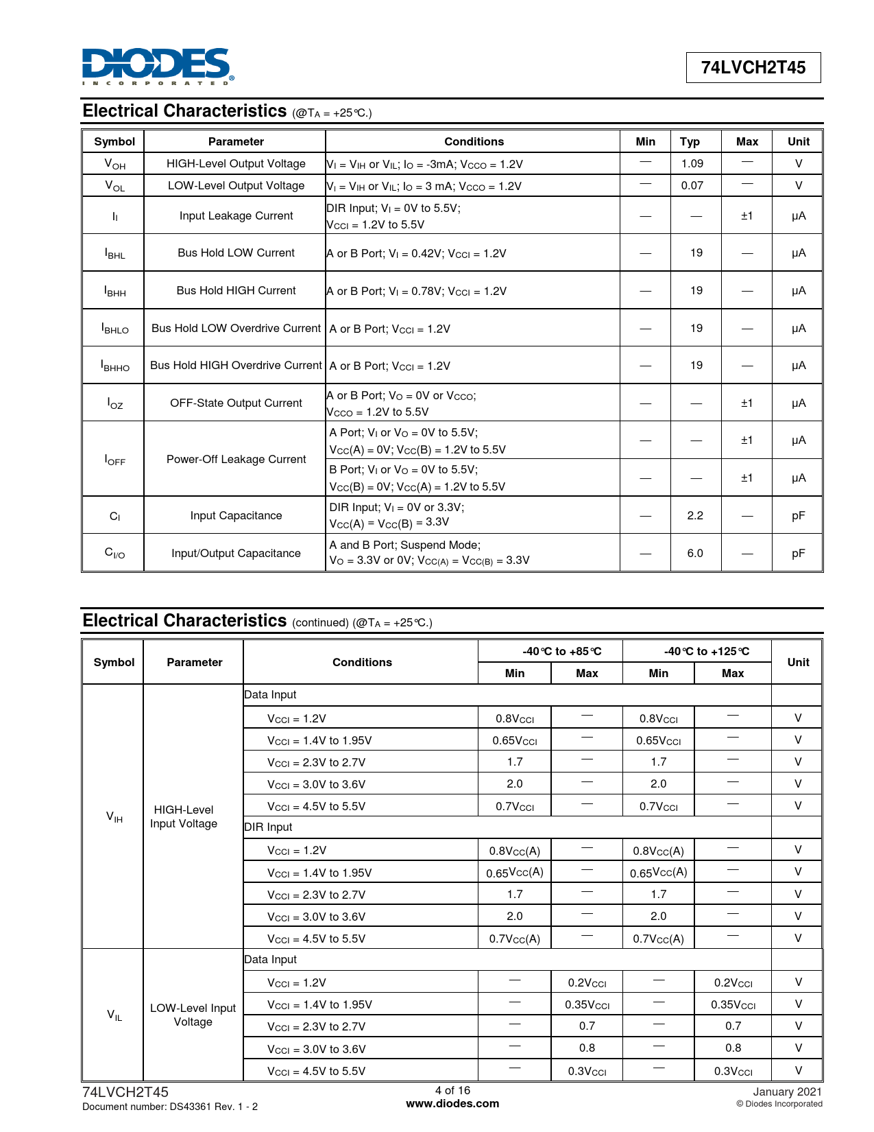 74LVCH2T45. Electrical Characteristics. Symbol. Parameter. Conditions. Min. Typ. Max. Unit. -40°C to +85°C. -40°C to +125°C. www.diodes.com